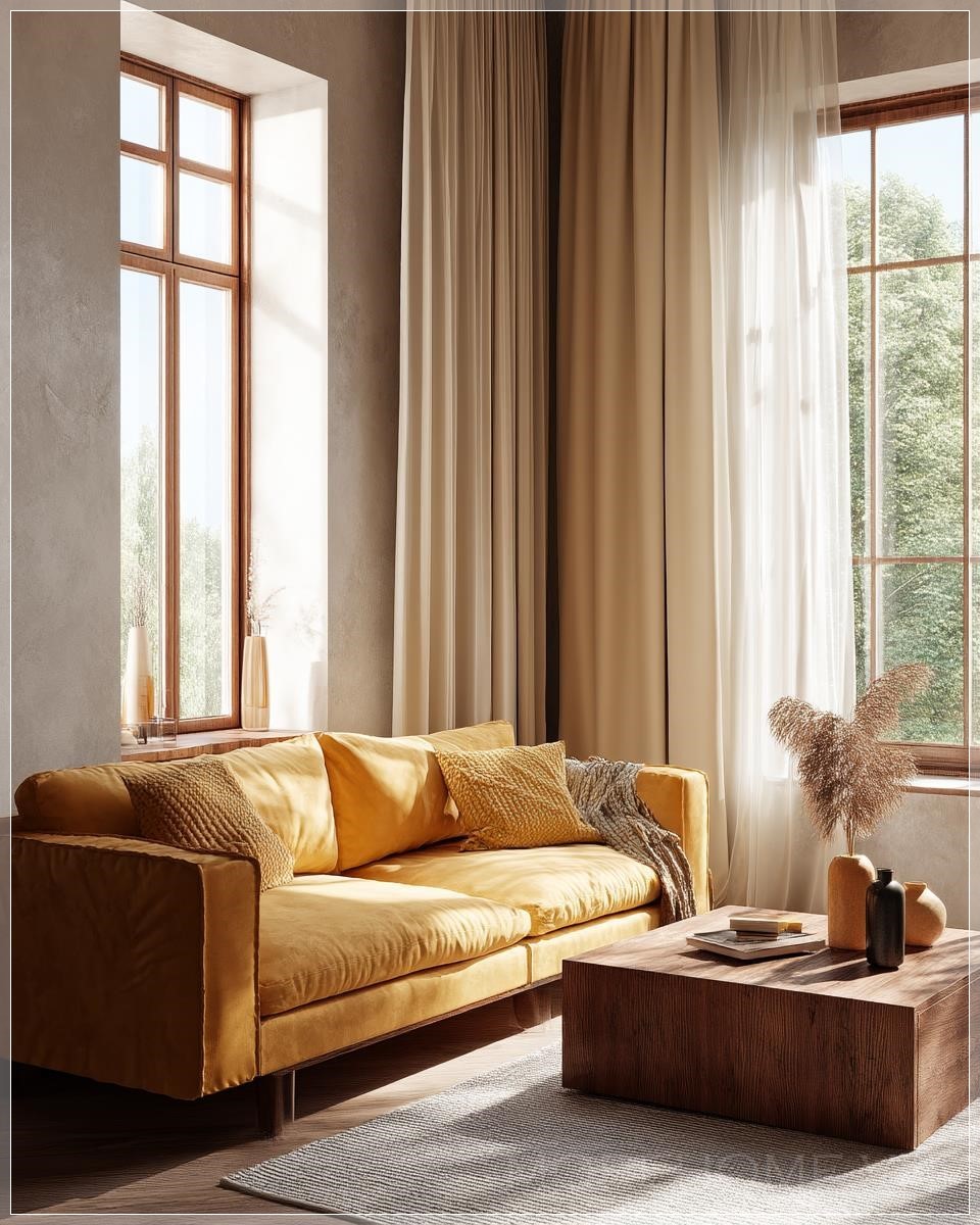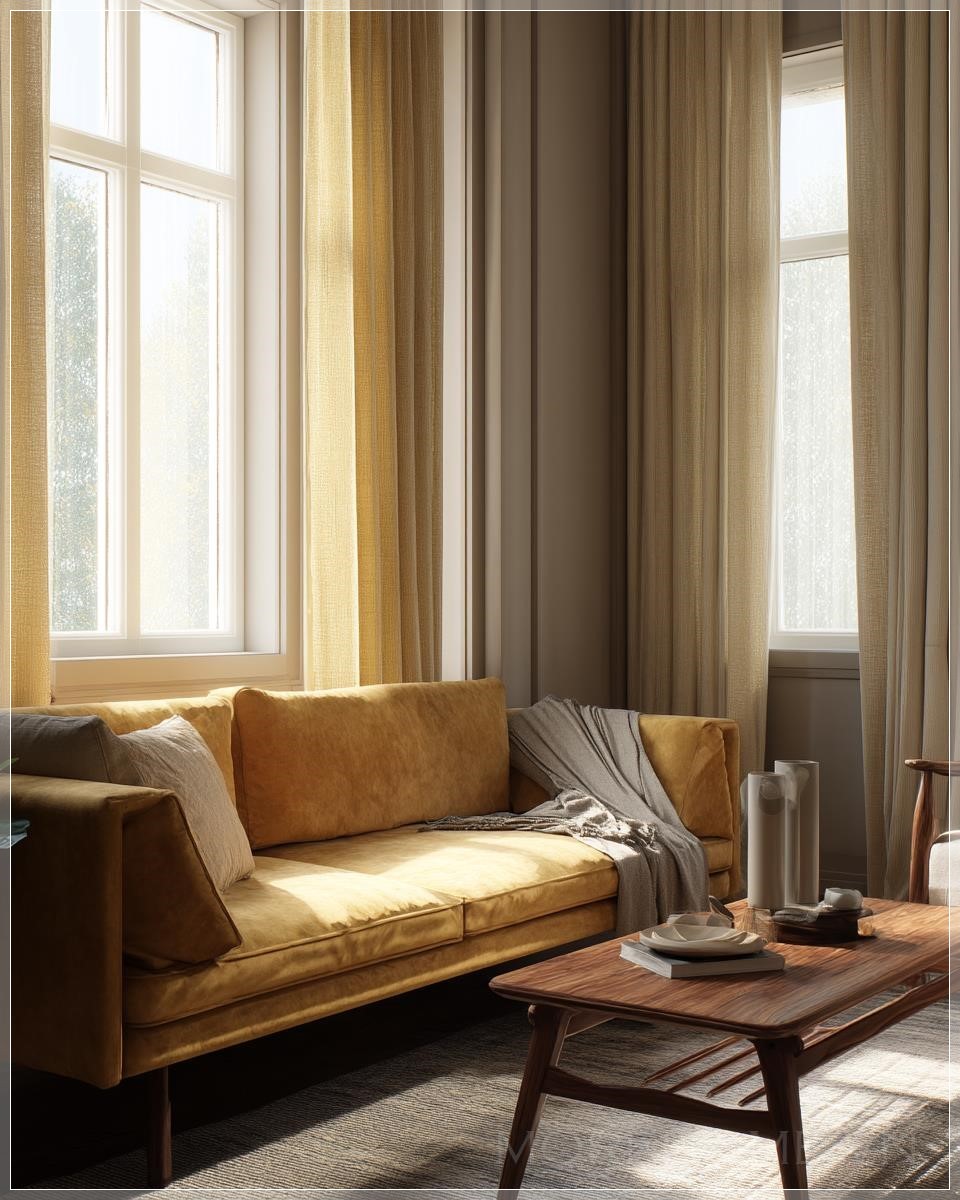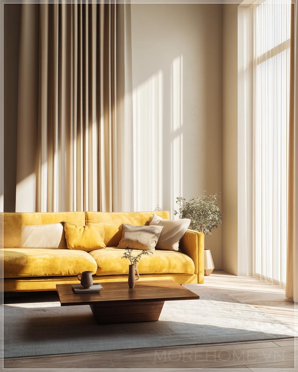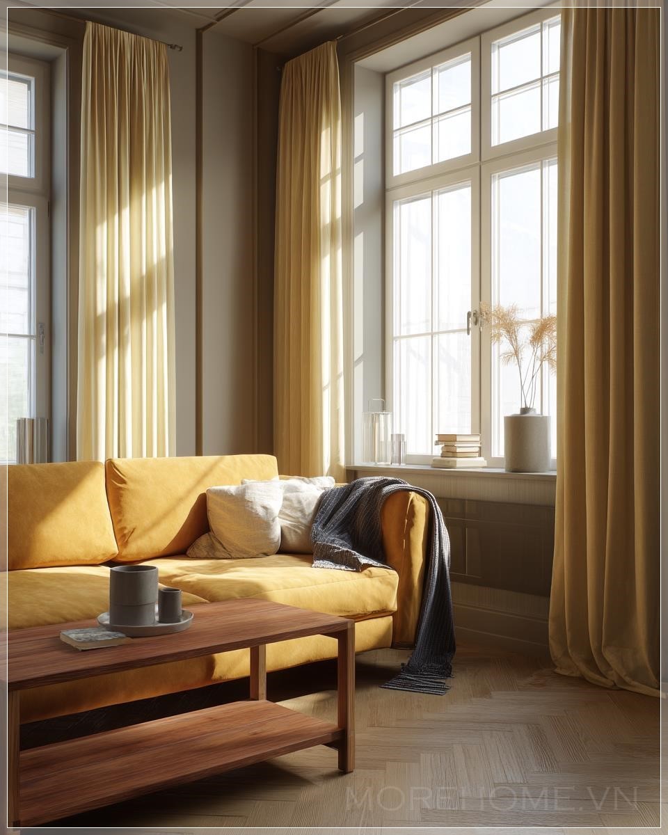 Một cảnh nội thất sang trọng với màu vàng, bao gồm một chiếc sofa da lộn màu vàng caramel, bàn cà phê gỗ, rèm vải mềm màu sáng, tường màu trung tính, ánh sáng mặt trời lọt qua, tạo nên không gian ấm cúng của một ngôi nhà theo phong cách Scandinavian hiện đại.