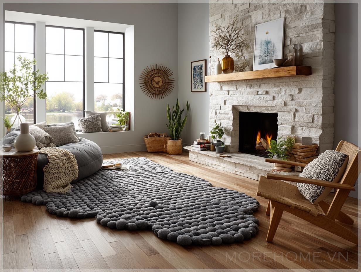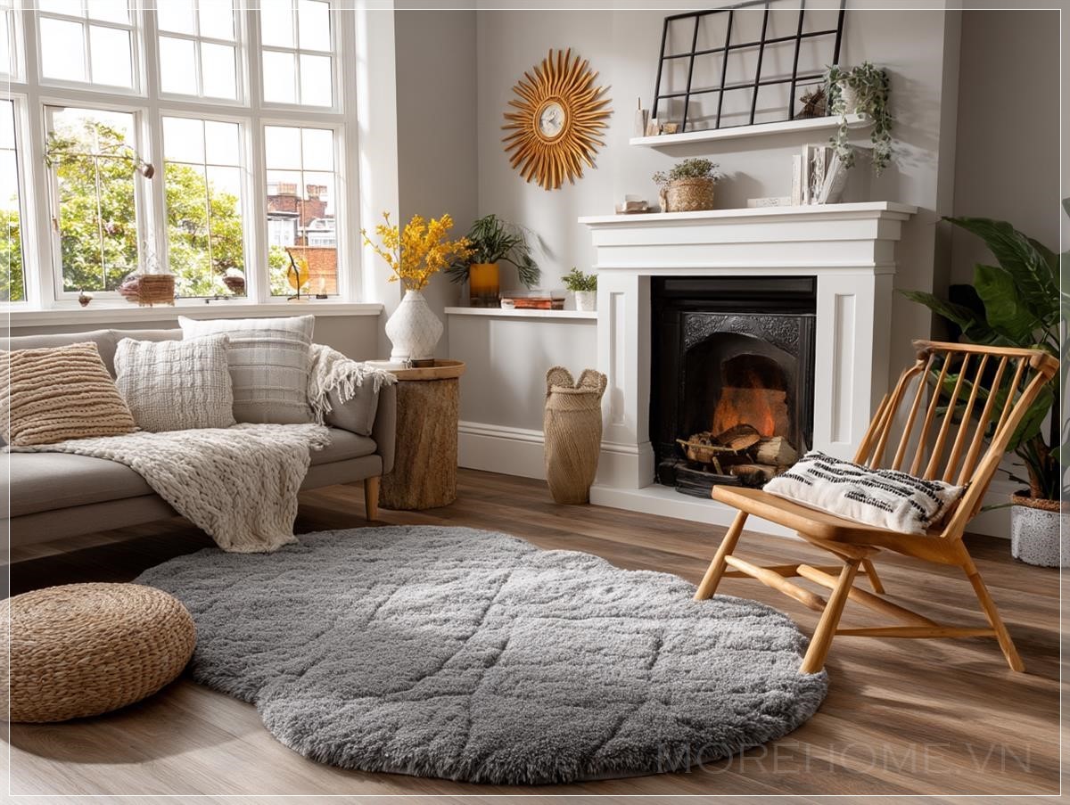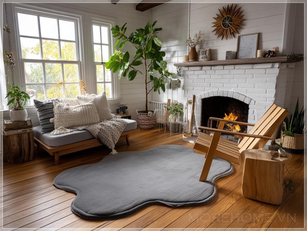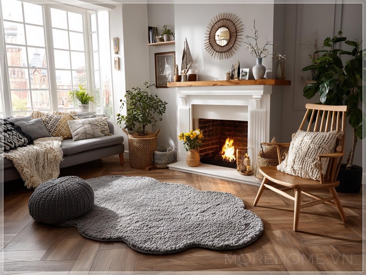Phòng khách này có một tấm thảm xám với hình dáng không đều trên sàn gỗ. Phòng có một lò sưởi trắng, một chiếc ghế gỗ, và một chiếc sofa với những chiếc gối đan, cùng các vật dụng trang trí như đồng hồ mặt trời, một lọ hoa với cành cây, và nhiều món đồ trên bệ cửa sổ treo trên tường. Tổng thể không gian trang trí ấm cúng và mời gọi.