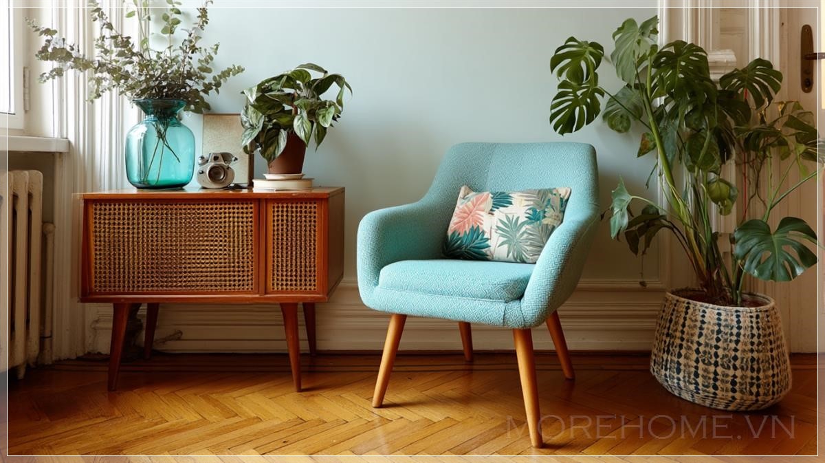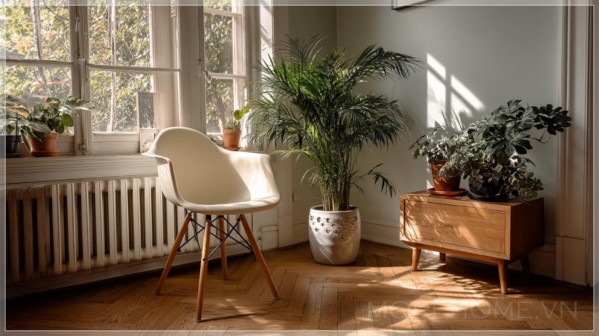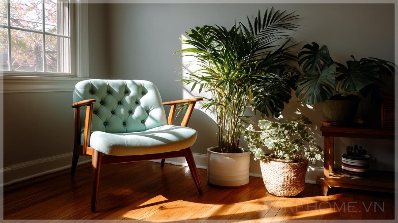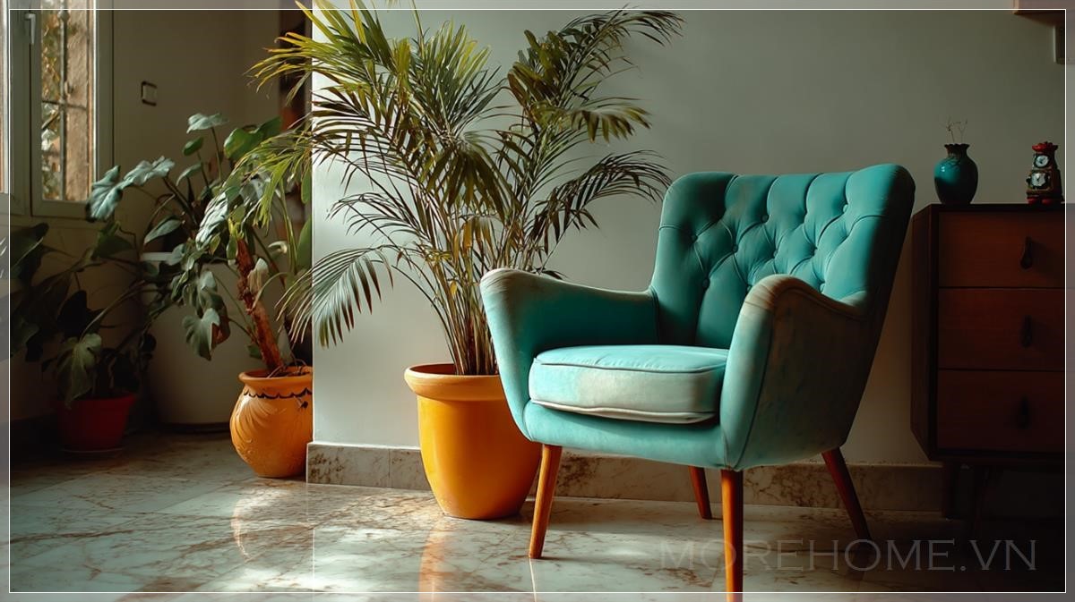 Ghế phong cách giữa thế kỷ đặt cạnh chậu cây cảnh, căn phòng sáng sủa. Liên hệ: https://zalo.me/morehomevietnam