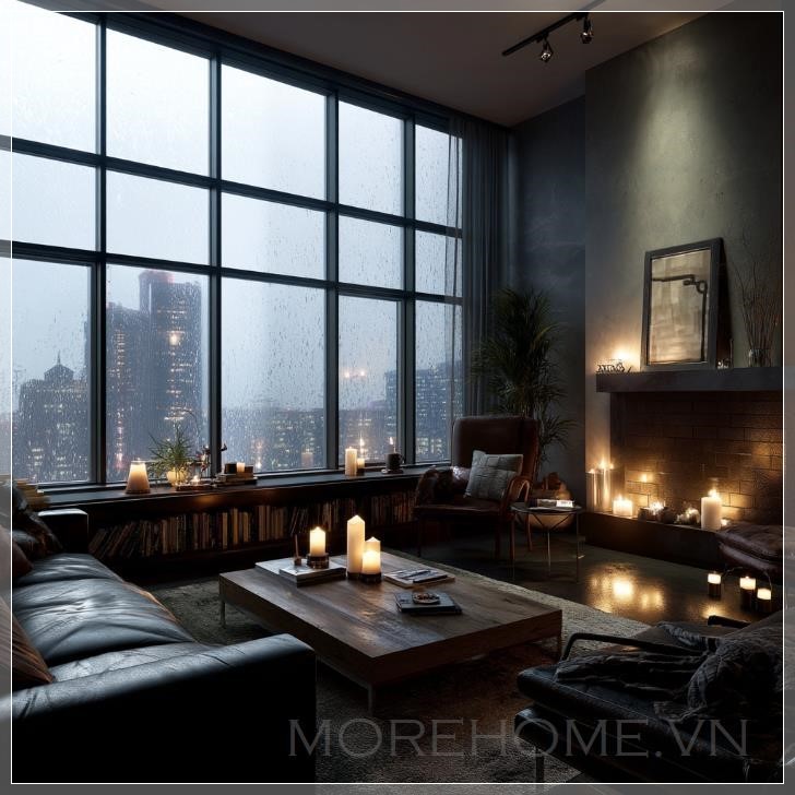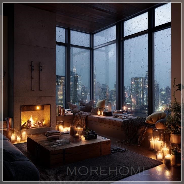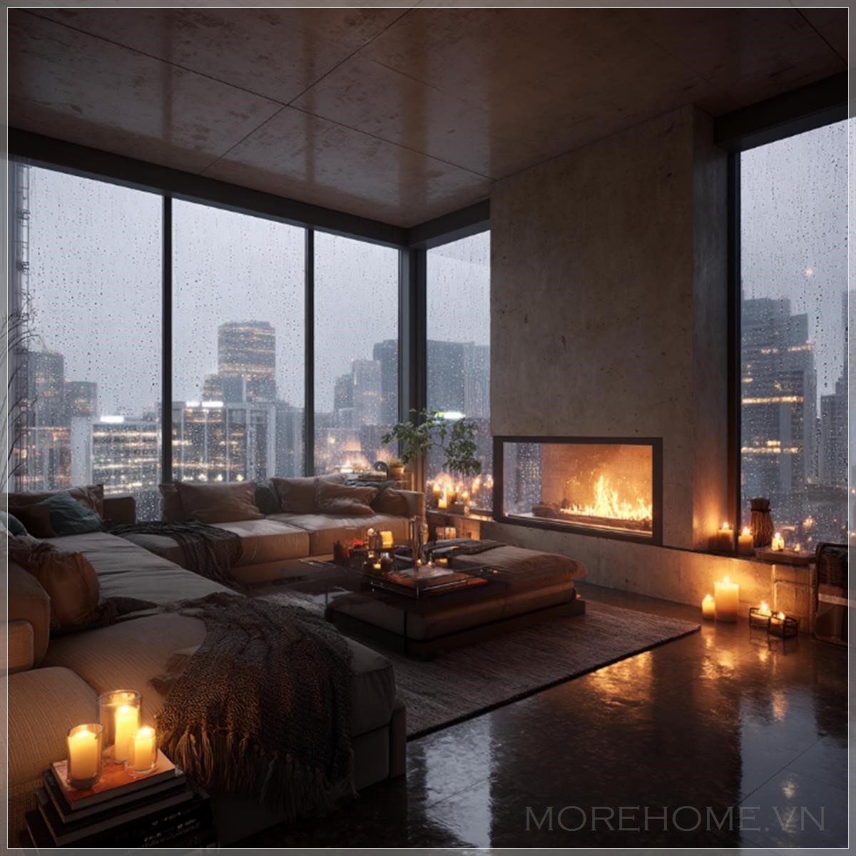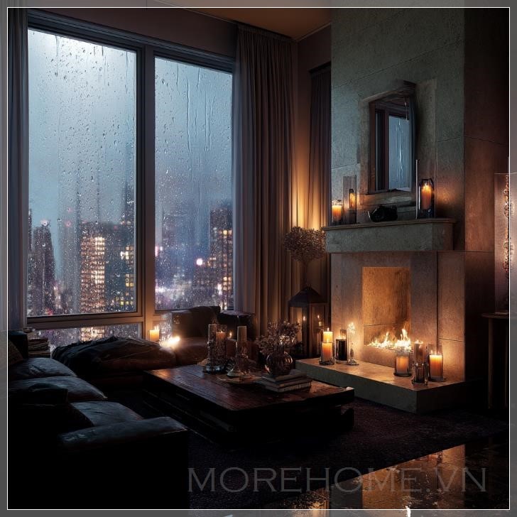 Nội thất căn hộ siêu thực với cảnh quan thành phố sáng rực qua cửa sổ bị ướt mưa, lò sưởi cháy và ánh sáng từ đèn bàn mềm mại, nến trên mọi bề mặt, chất liệu cao cấp, tông màu trung tính, bóng tối ấm áp. Liên hệ: https://zalo.me/morehomevietnam
