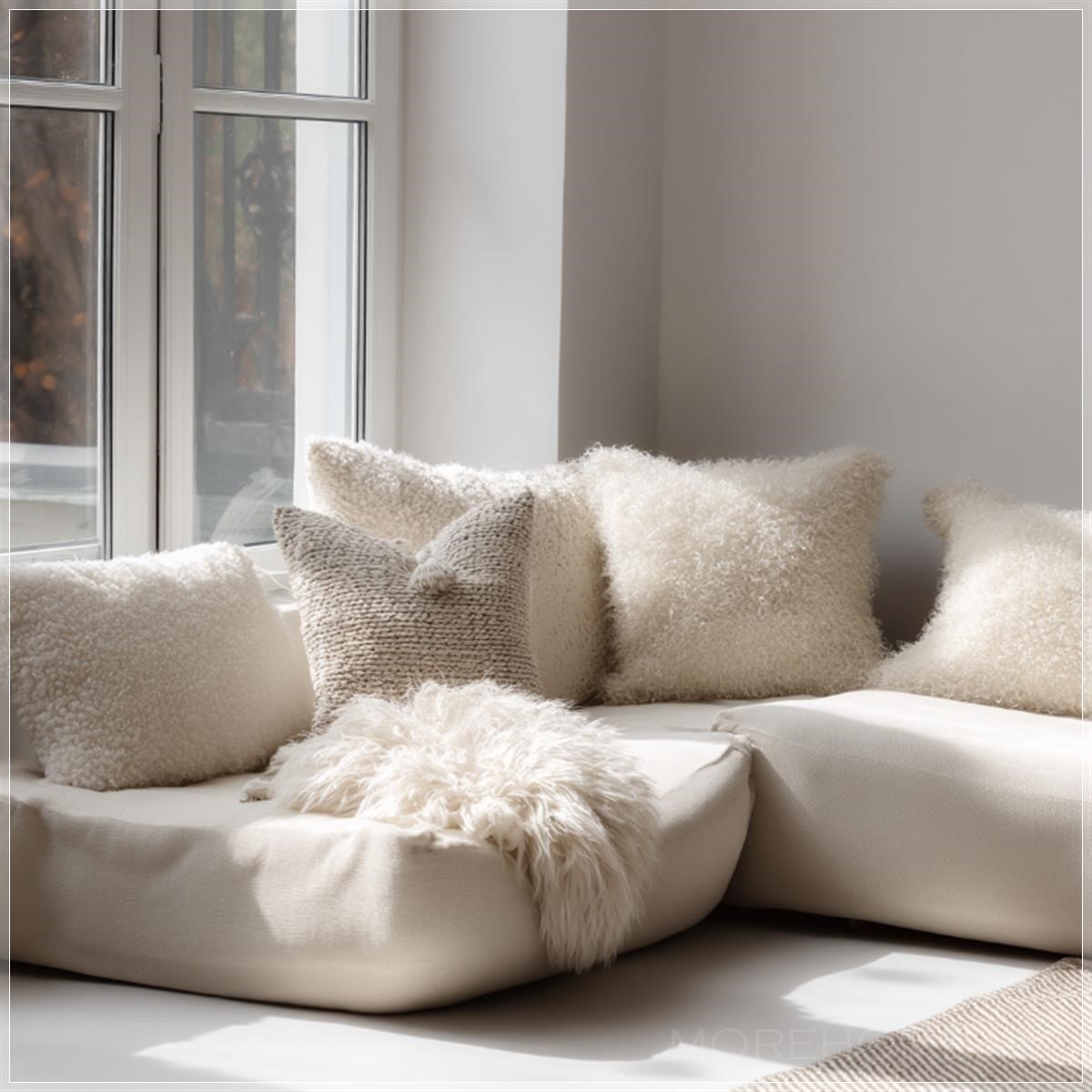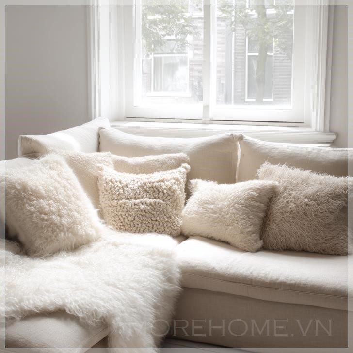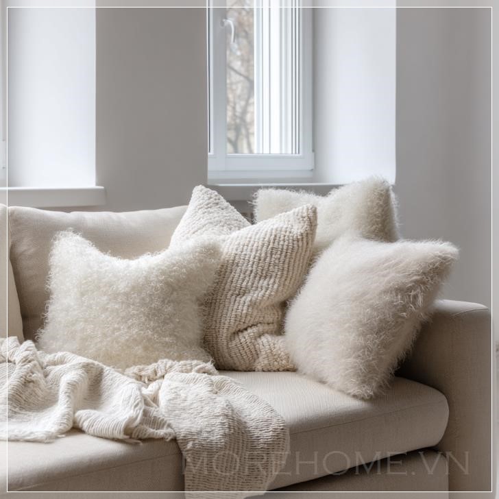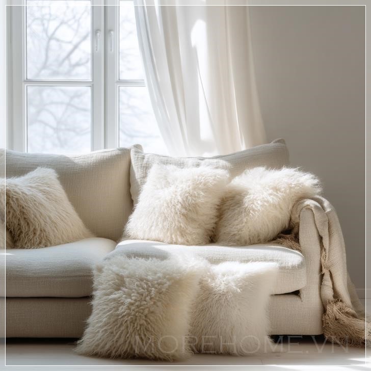 Góc phòng ấm cúng, mờ ảo với tông màu hồng phấn, ghế sofa vải lanh màu be, gối mềm mại màu kem, ánh sáng tự nhiên từ cửa sổ lớn chiếu vào, phong cách Scandinavian boho. Liên hệ: https://zalo.me/morehomevietnam