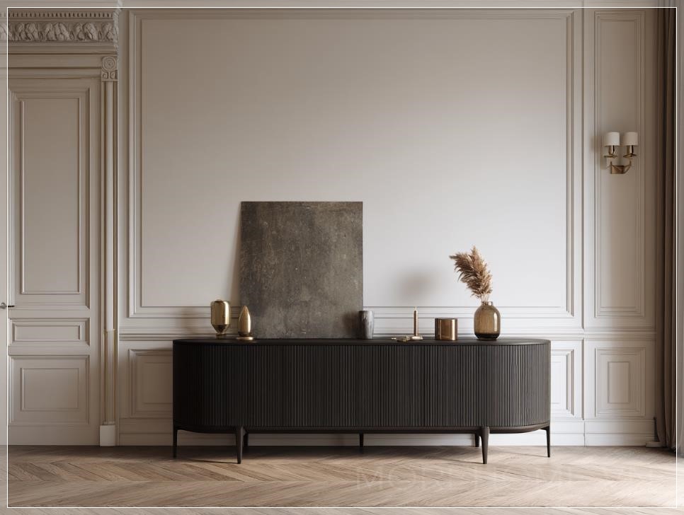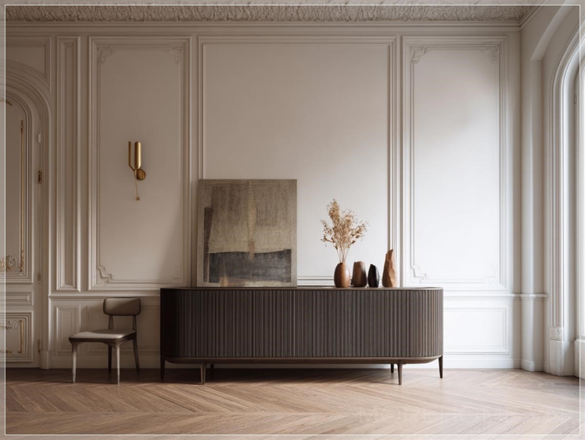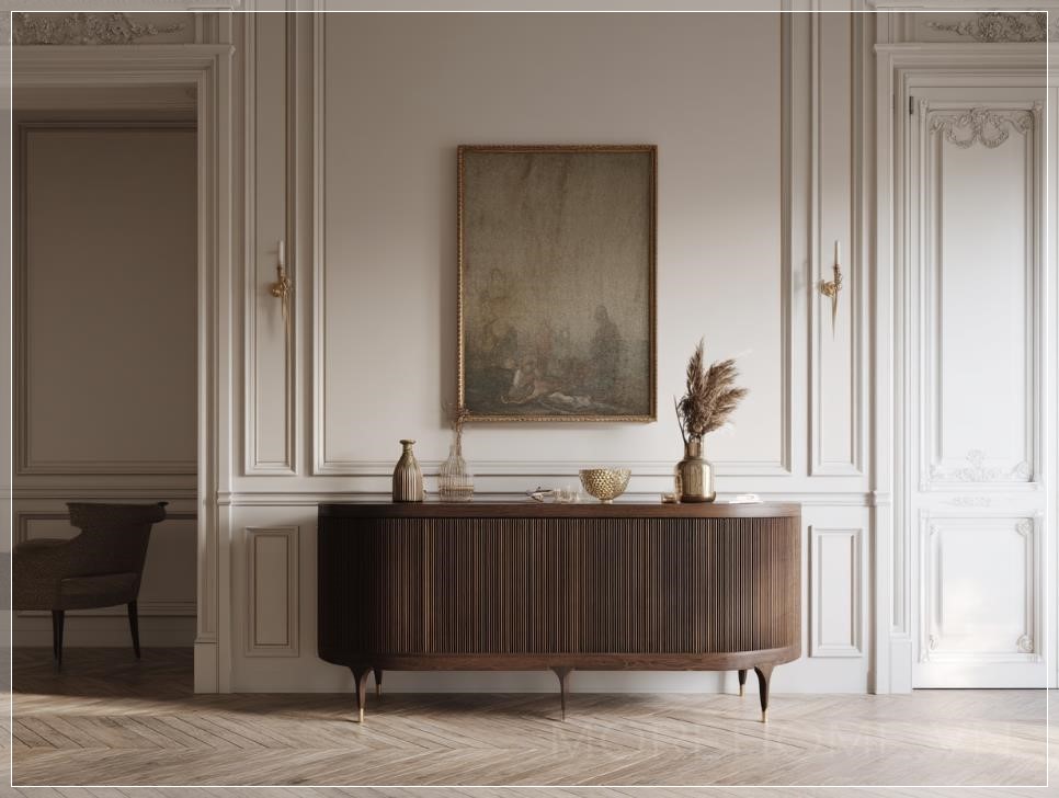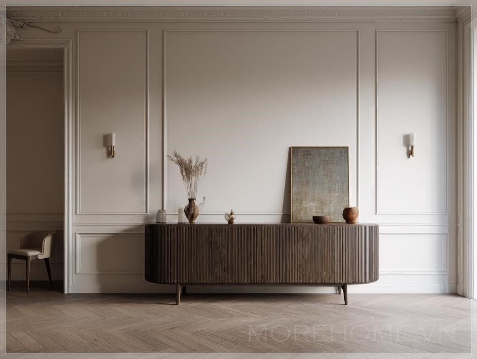 Bàn console bên trong hành lang vào của ngôi nhà theo phong cách cổ điển tối giản, thiết kế thanh thoát với bề mặt gỗ mịn, màu sắc trung tính, nổi bật với các đường nét sạch sẽ và gọn gàng. Trên bàn là một chiếc đèn bàn đơn giản nhưng sang trọng, một vài vật trang trí nhỏ như bình hoa hoặc tượng trưng, tạo nên một không gian chào đón ấm cúng nhưng vẫn giữ được sự tinh tế và nhẹ nhàng.