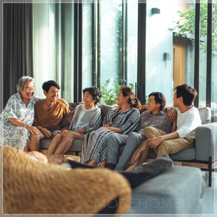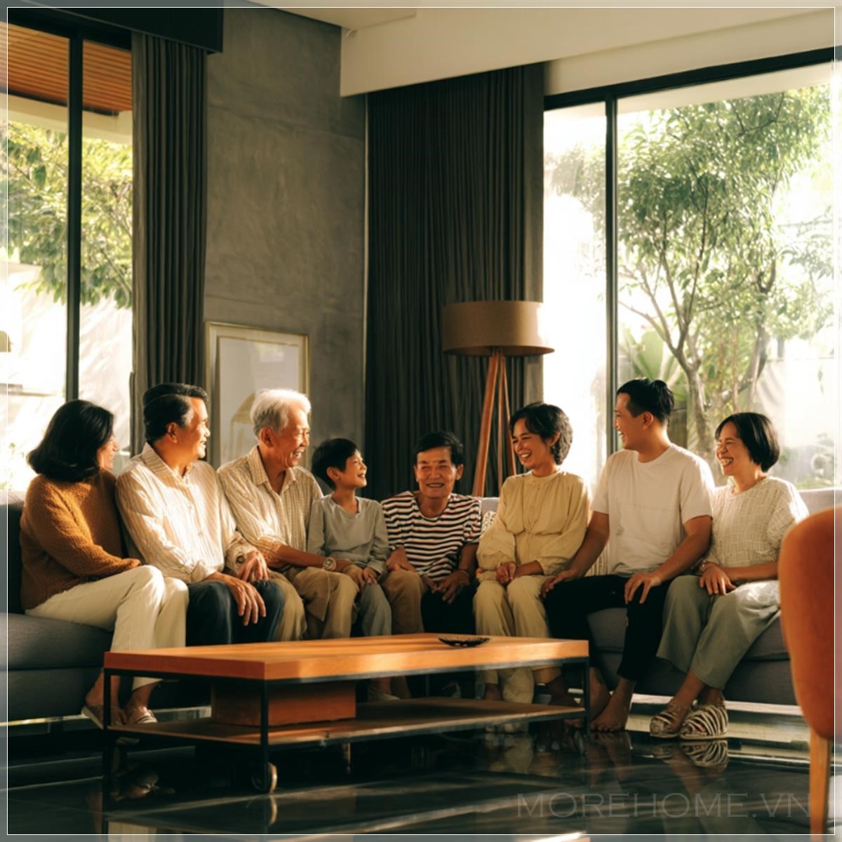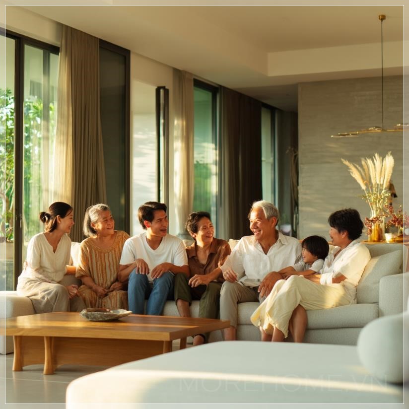 Một gia đình đa thế hệ Thái Lan lớn đang trò chuyện vui vẻ trong phòng khách hiện đại, không khí thư giãn và hạnh phúc, khoảnh khắc tự nhiên, ánh sáng giờ vàng tự nhiên, thiết kế nội thất ấm cúng, đồ đạc hiện đại tối giản, cửa sổ lớn với ánh sáng mặt trời chiếu vào, nụ cười chân thật và những tương tác nhẹ nhàng, tông màu điện ảnh, không có chữ, phong cách nhiếp ảnh 4K.