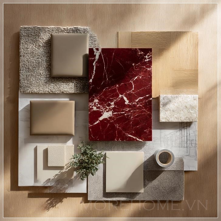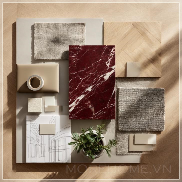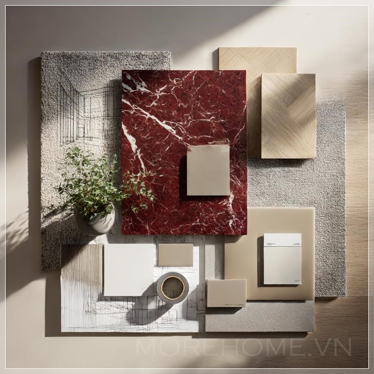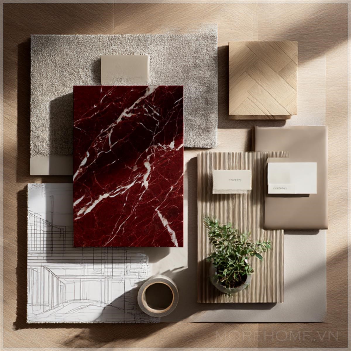 Bảng mood board thiết kế nội thất theo kiểu flat lay, với đá Marble Rosso Levanto là vật liệu trung tâm, màu đỏ đậm với vân trắng bold, xung quanh là các kết cấu và hoàn thiện bổ sung bao gồm: mẫu sàn gỗ tự nhiên với vân gỗ nhẹ, thảm trừu tượng màu xám-beige cũ (ID: 15789), vải dệt hình học với các tông màu taupe và ivory, mảnh da màu beige mịn, bề mặt vữa màu xám mềm mại, giấy dán tường Drawings của Studijo với những bản vẽ kiến trúc tay, và chậu cây cảnh nhỏ bằng gốm tạo sự tương phản hữu cơ. Bố cục hiện đại tối giản với phông chữ tinh tế, mẫu giấy, băng dính, bóng mờ tự nhiên nhẹ nhàng và bảng màu trung tính ấm áp, mang phong cách biên tập cao cấp.