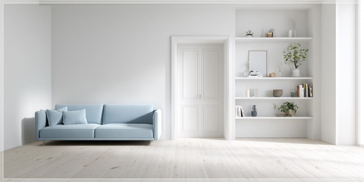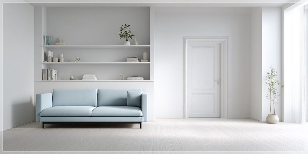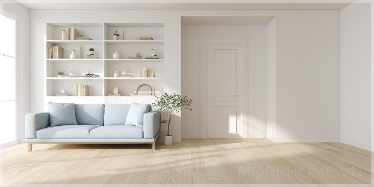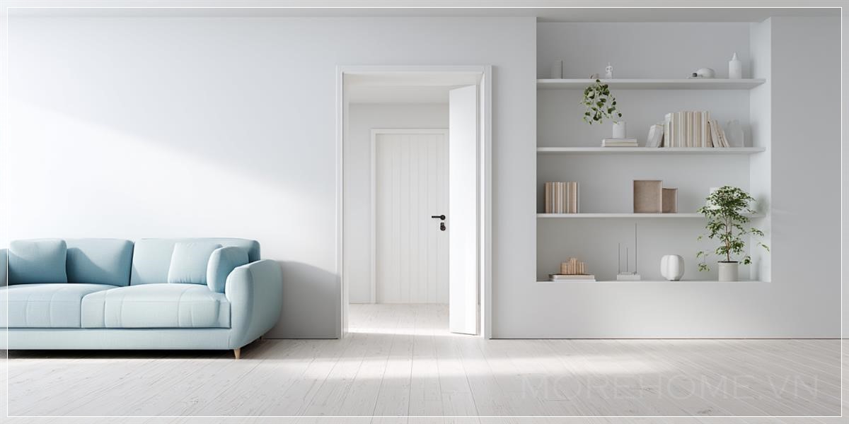 Phòng khách sáng sủa, tối giản với thiết kế hiện đại sạch sẽ. Sàn nhà làm từ gỗ sáng màu, trải đều khắp không gian. Tường được sơn màu trắng nhẹ, tạo cảm giác rộng rãi và thoáng đãng. Trên tường phía sau là một kệ sách tích hợp màu trắng, được bố trí gọn gàng với các món đồ trang trí như sách, một chậu cây nhỏ và các vật trang trí tối giản. Cửa nội thất màu trắng nằm chính giữa bức tường phía sau, hòa nhập vào phong cách tối giản. Phía bên phải, một chiếc sofa màu xanh nhạt, kiểu dáng hiện đại với các đường nét đơn giản được đặt gần tường, góp phần tạo nên phong cách tinh tế nhưng giản dị của căn phòng. Ánh sáng tự nhiên nhẹ nhàng chiếu sáng không gian, tạo ra những bóng đổ và ánh sáng tinh tế, làm tăng thêm cảm giác yên bình và rộng rãi cho căn phòng.