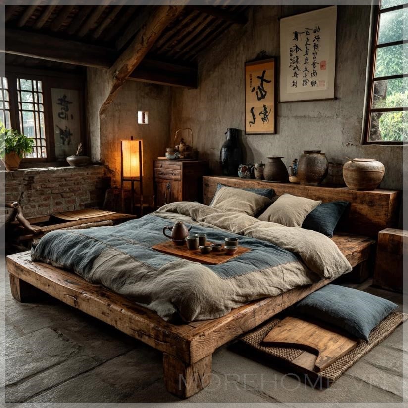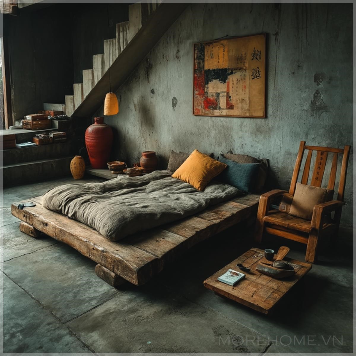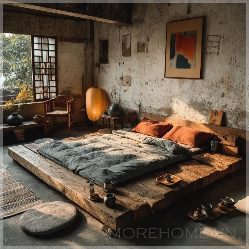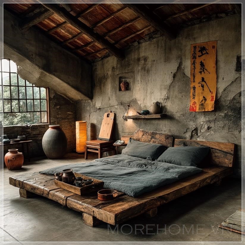 Phòng ngủ theo phong cách Wabi-sabi trong một homestay ở Đài Loan rộng rãi và yên bình. Một chiếc giường khung gỗ được làm từ gỗ cây bời lời cũ đặt trong phòng, với bề mặt thô ráp và không bóng, thể hiện cảm giác của sự thời gian. Trước bức tường kết cấu trắng, gần giường, có một chiếc ghế gỗ và một chiếc thớt gỗ. Cạnh đó là một chiếc bình hoa và một đèn sàn có tông màu ấm. Trong sân, có một bức tranh trừu tượng treo trên tường. Từ góc nghiêng của chiếc giường, không gian yên tĩnh và thoải mái được tạo ra với ống kính macro của máy ảnh Sony.