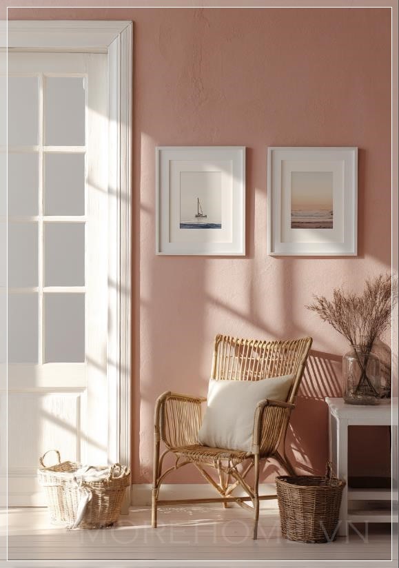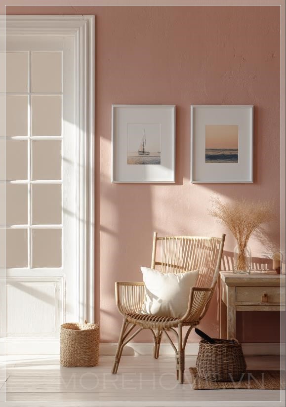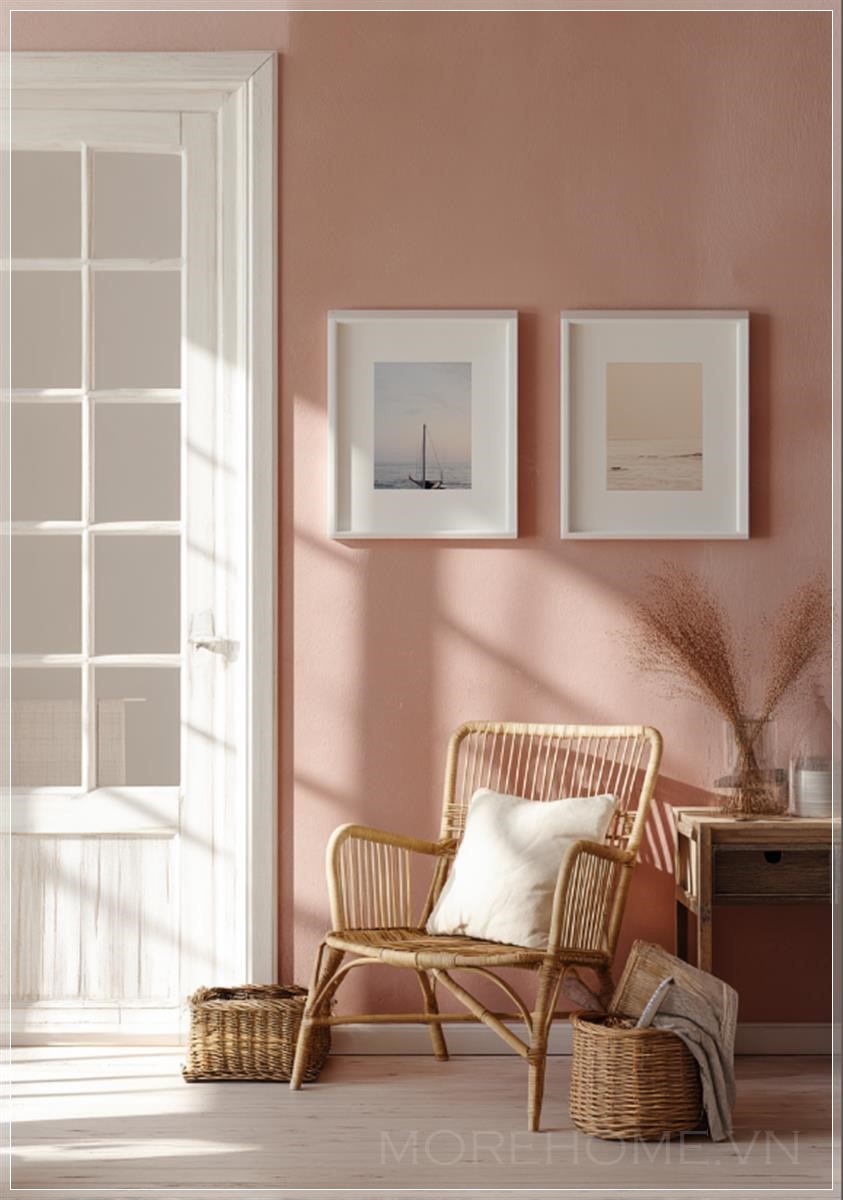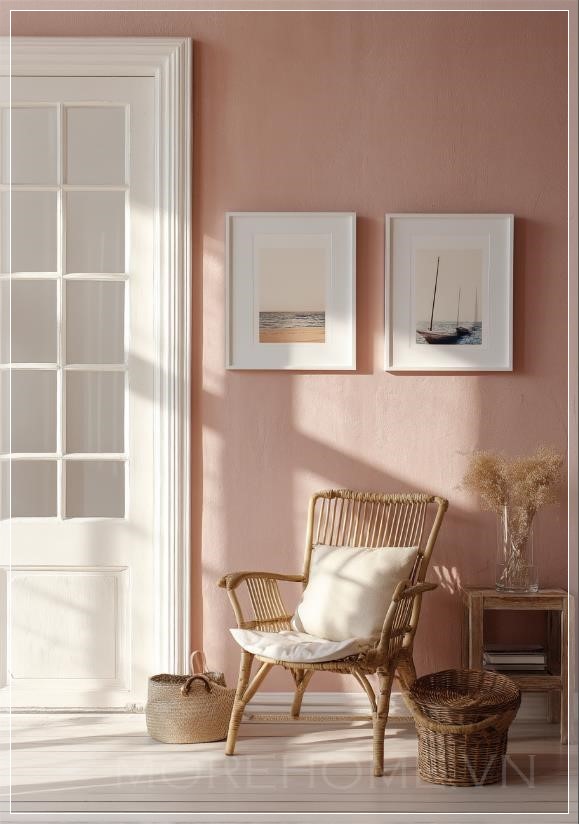 Ảnh chụp một bức tường màu hồng với hai khung ảnh trắng, ánh sáng và bóng mờ nhẹ, phong cách thiết kế nội thất Scandinavian, không gian ấm cúng, đồ nội thất bằng gỗ, một chiếc ghế bành mây ở giữa, một chiếc giỏ ở bên cạnh, cửa ở phía bên phải, cửa sổ phía sau ghế, và các gam màu pastel.