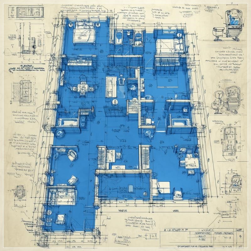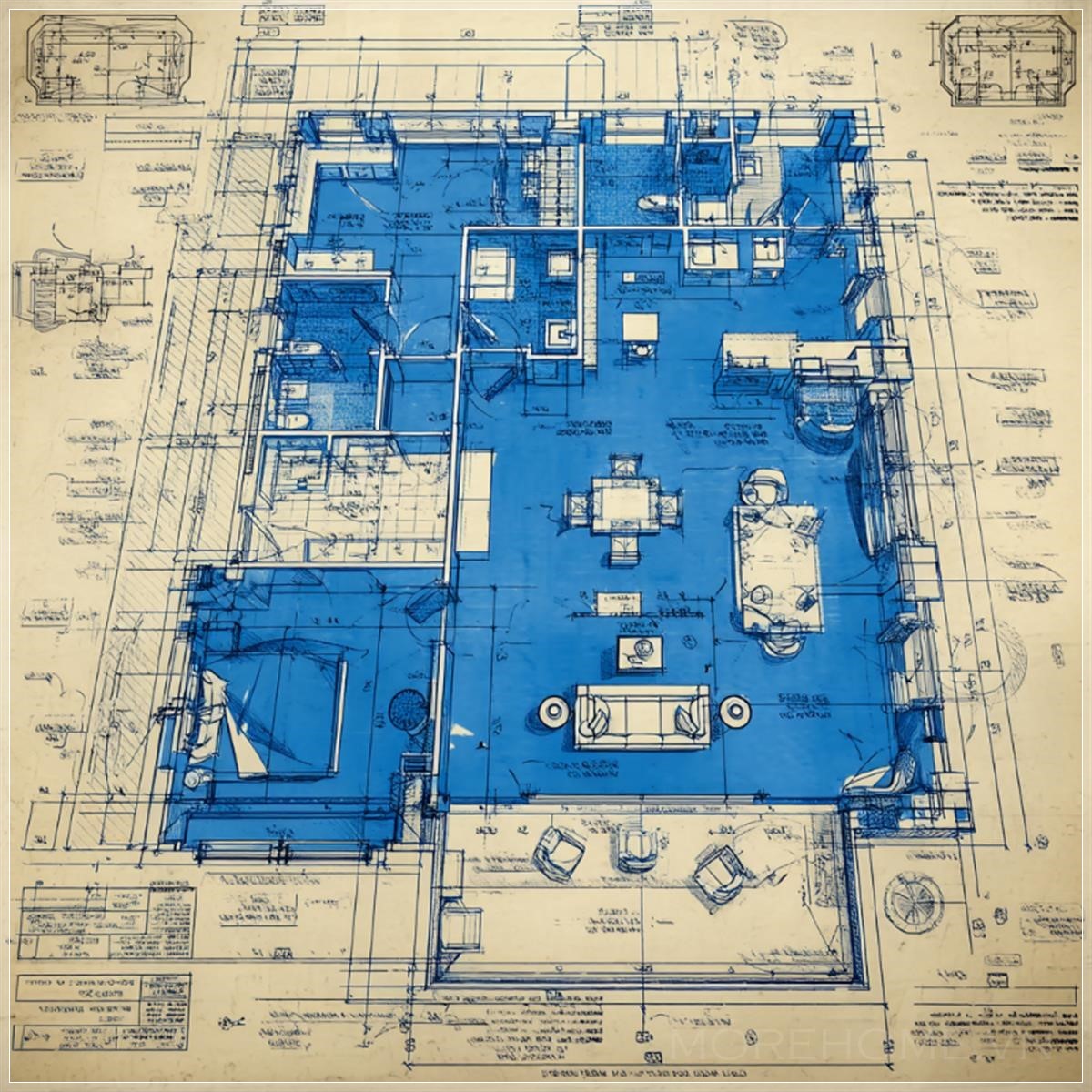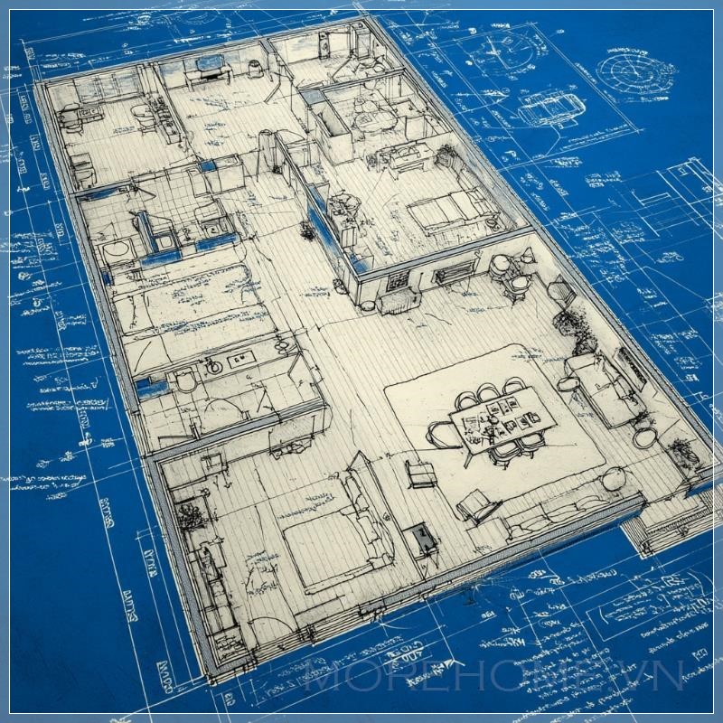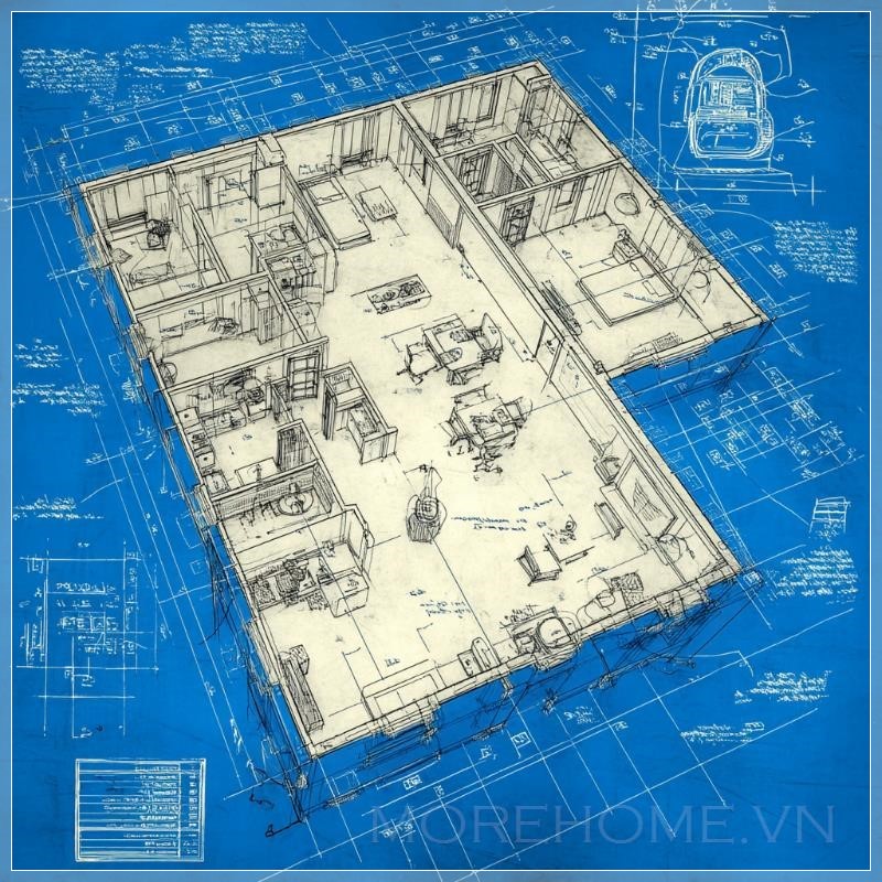 Bản vẽ thiết kế kiến trúc của các phòng, nền xanh. Liên hệ: https://zalo.me/morehomevietnam