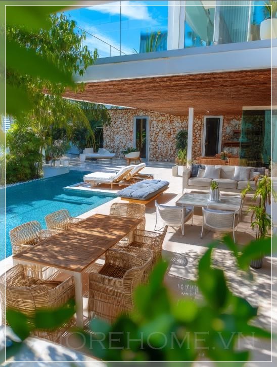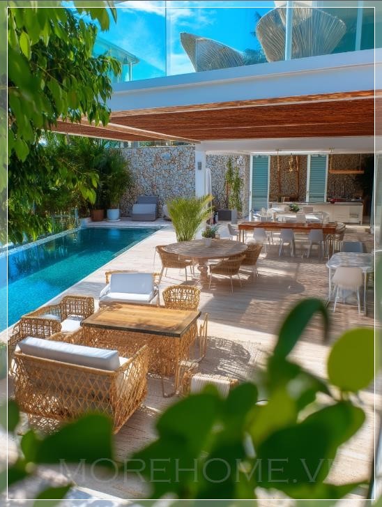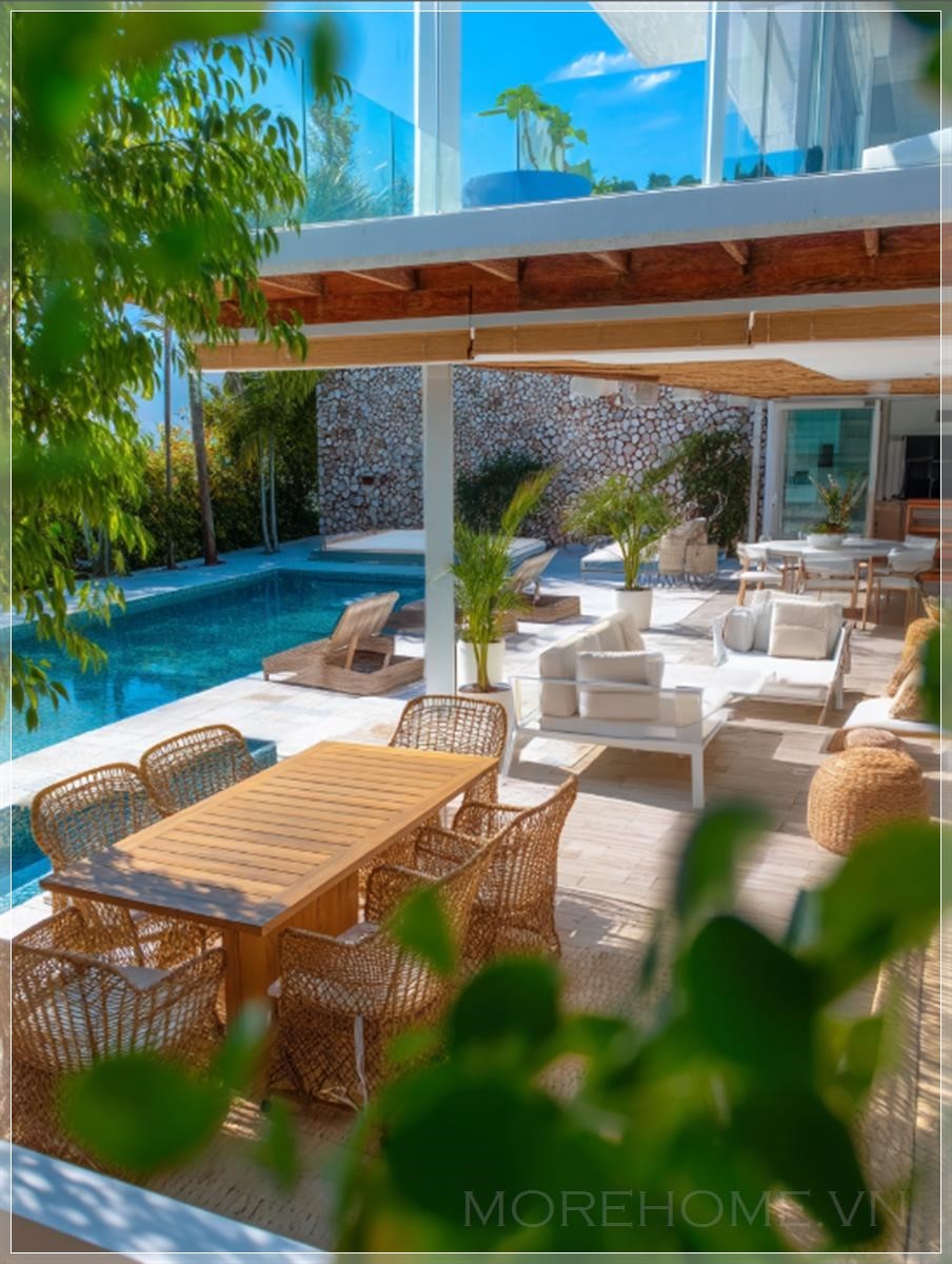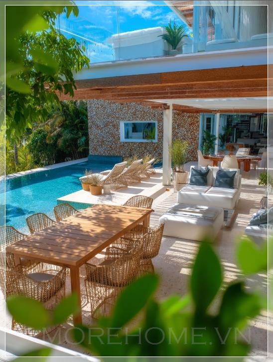 Khu vực sinh hoạt ngoài trời tại một biệt thự nhiệt đới ở Miami, Florida, được chụp từ một góc cao, mang đến một cái nhìn rộng lớn với bầu trời xanh tươi sáng. Không gian này kết hợp hoàn hảo giữa yếu tố trong nhà và ngoài trời, với một patio rộng lớn dẫn ra hồ bơi. Nội thất bao gồm những chiếc ghế ăn thanh lịch và ghế nằm dệt, mang đến sự pha trộn giữa các chất liệu hiện đại và tự nhiên. Bảng màu chủ đạo là sự hòa hợp giữa các tông màu trung tính và điểm xuyết màu xanh từ cây cối, tạo ra một bầu không khí thư giãn. Ánh sáng tự nhiên chiếu qua các cửa sổ và cửa ra vào lớn, làm nổi bật sự sáng sủa của không gian. Tường được hoàn thiện từ đá và gỗ, mang lại cảm giác ấm áp và tự nhiên. Việc sử dụng kính và không gian mở giúp không gian thoáng đãng, trong khi các chi tiết trang trí như gối bọc và cây cảnh trong chậu tăng thêm sự thoải mái và sang trọng. Cảnh quay được chụp bằng máy ảnh mirrorless Sony ILCE-7M3 với ống kính 17-28mm f/2.8, ISO 100, không gian màu sRGB, đo sáng đa phân đoạn, độ tương phản và độ bão hòa cao, với độ phơi sáng giảm -0.3 EV. Được chỉnh sửa trong Adobe Photoshop Lightroom Classic 12.5 để tăng cường độ sâu và chỉnh màu.