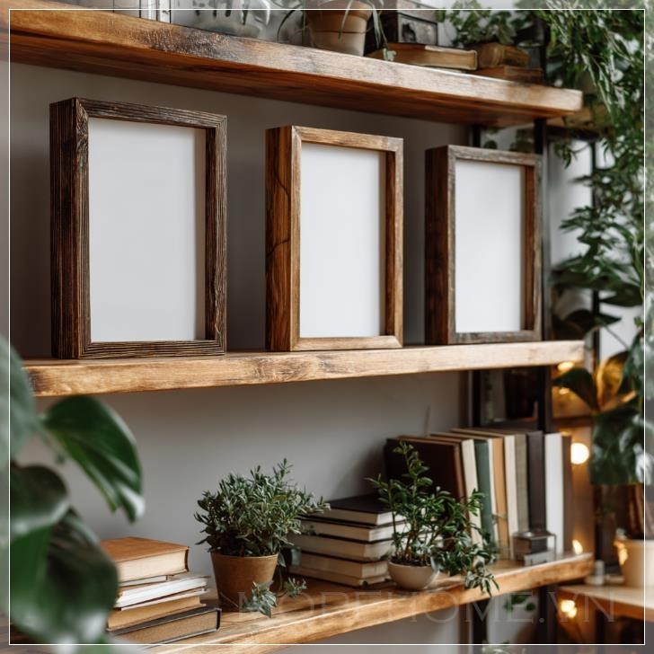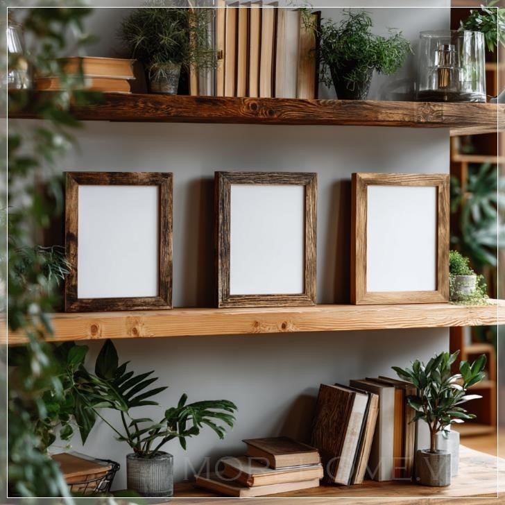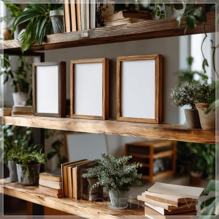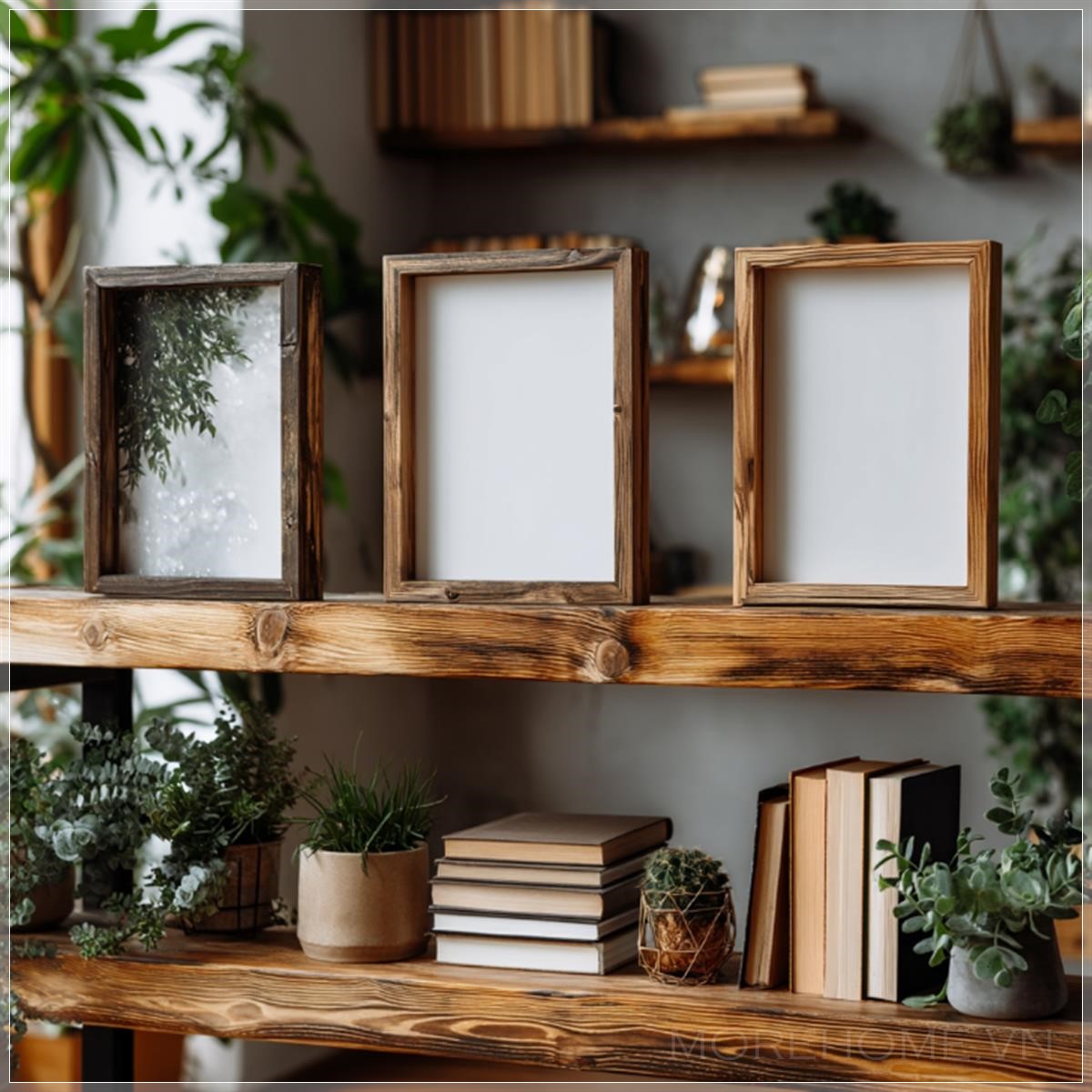 Ba khung ảnh hình chữ nhật bằng gỗ, bên trong mỗi khung là những bức ảnh hoàn toàn màu trắng, tất cả ba khung ảnh được đặt trên một kệ gỗ màu nâu sáng trong một căn phòng ấm cúng. Dưới kệ là một kệ sách với vài cây cảnh xanh trang trí.
