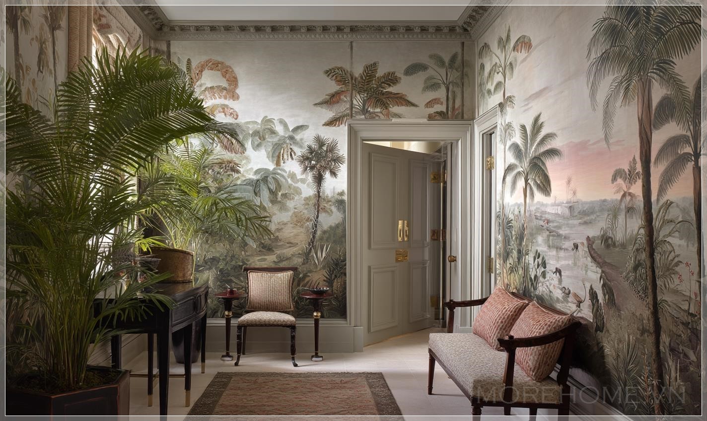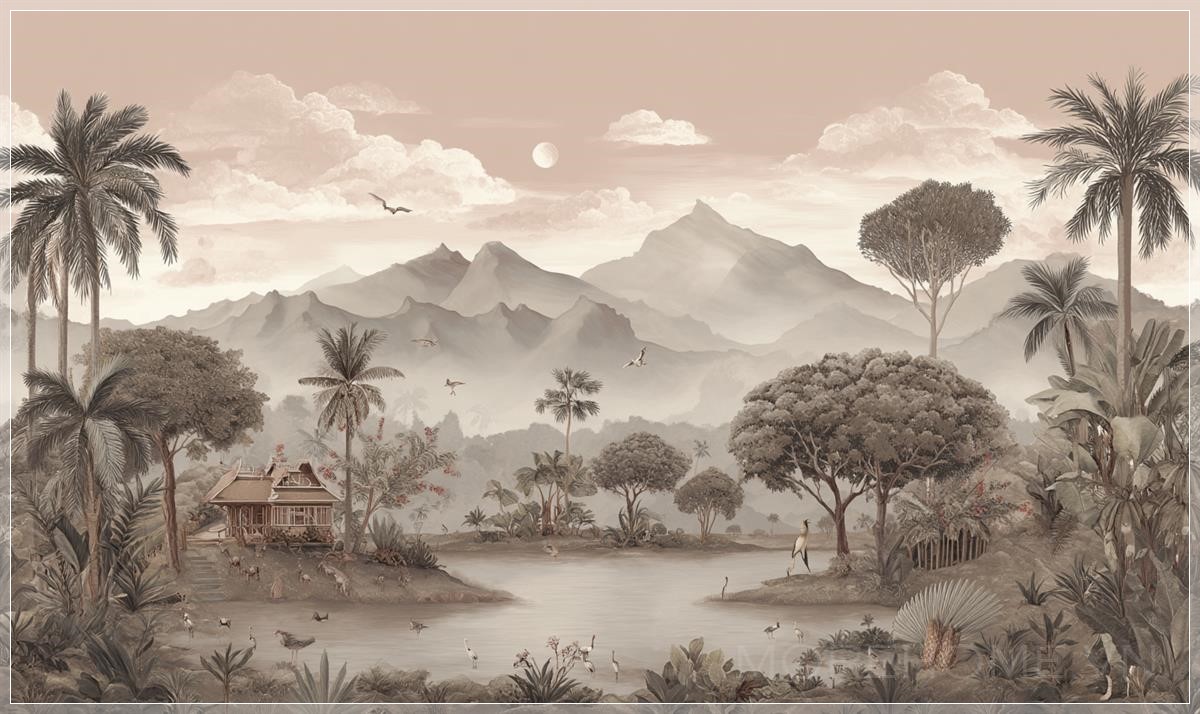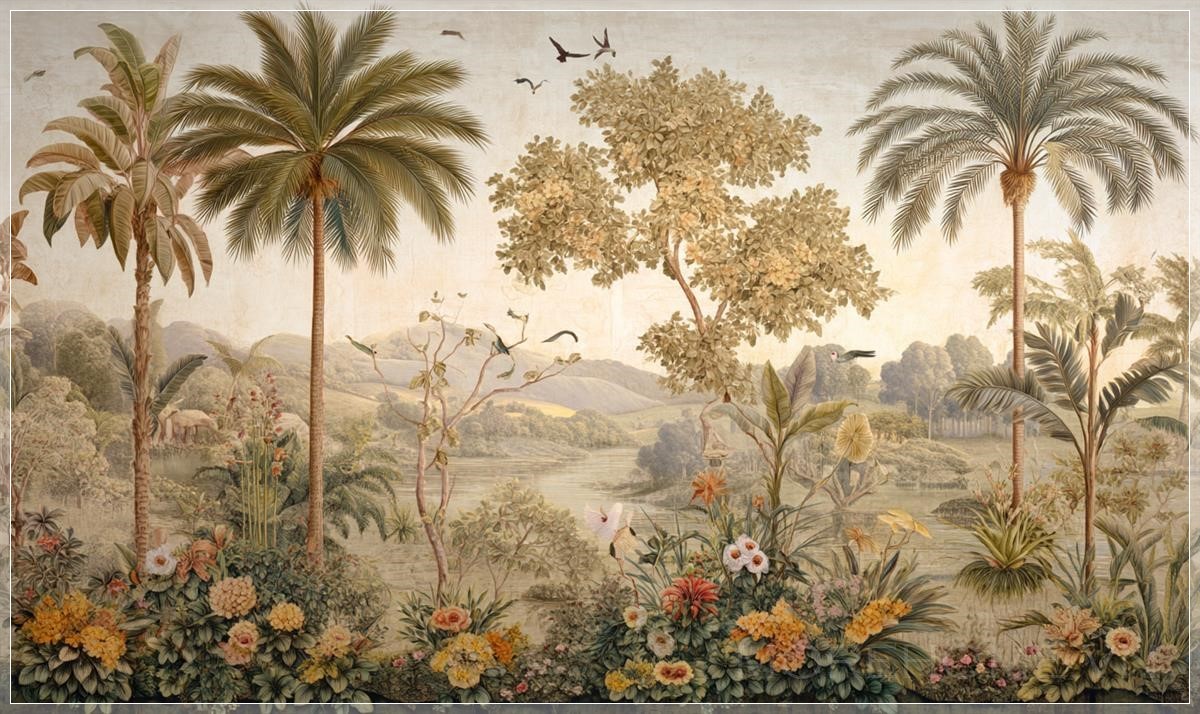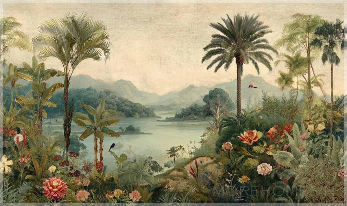Giấy dán tường cao cấp phong cách Anh, tranh tường vintage, thiết kế kỳ lạ, cảnh quan nhiệt đới, màu sắc nhẹ nhàng. Liên hệ: https://zalo.me/morehomevietnam