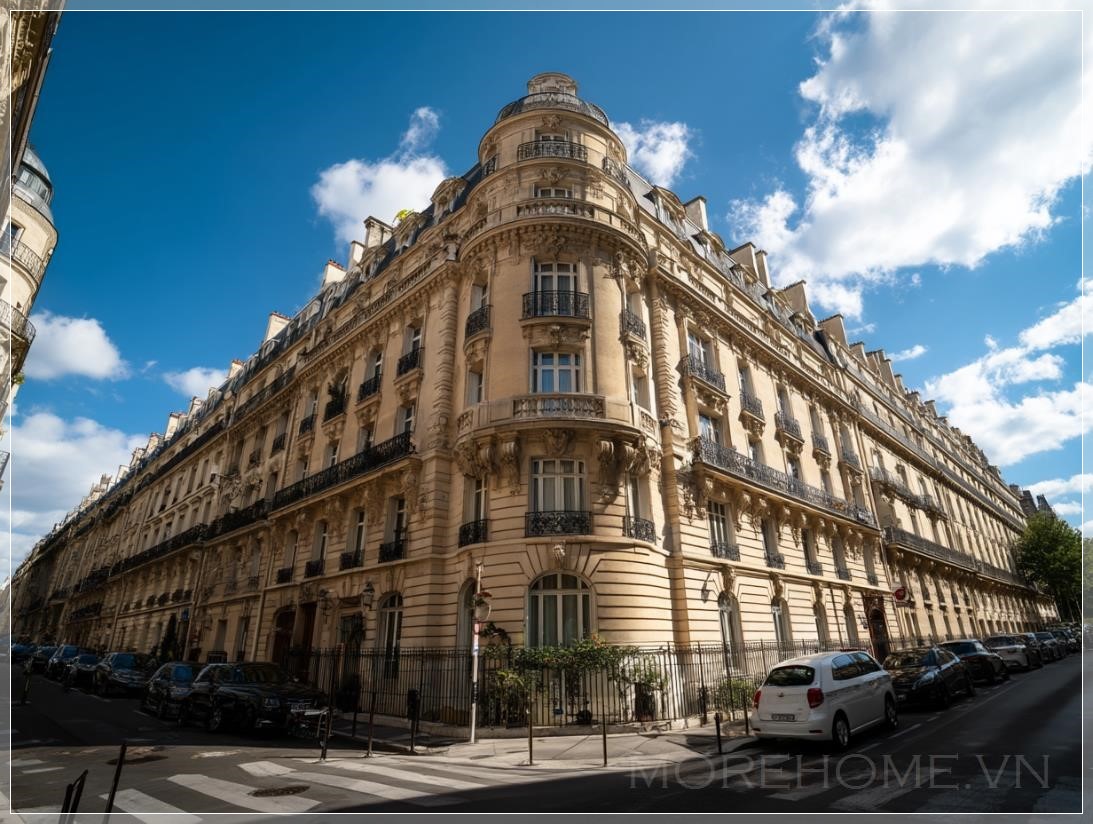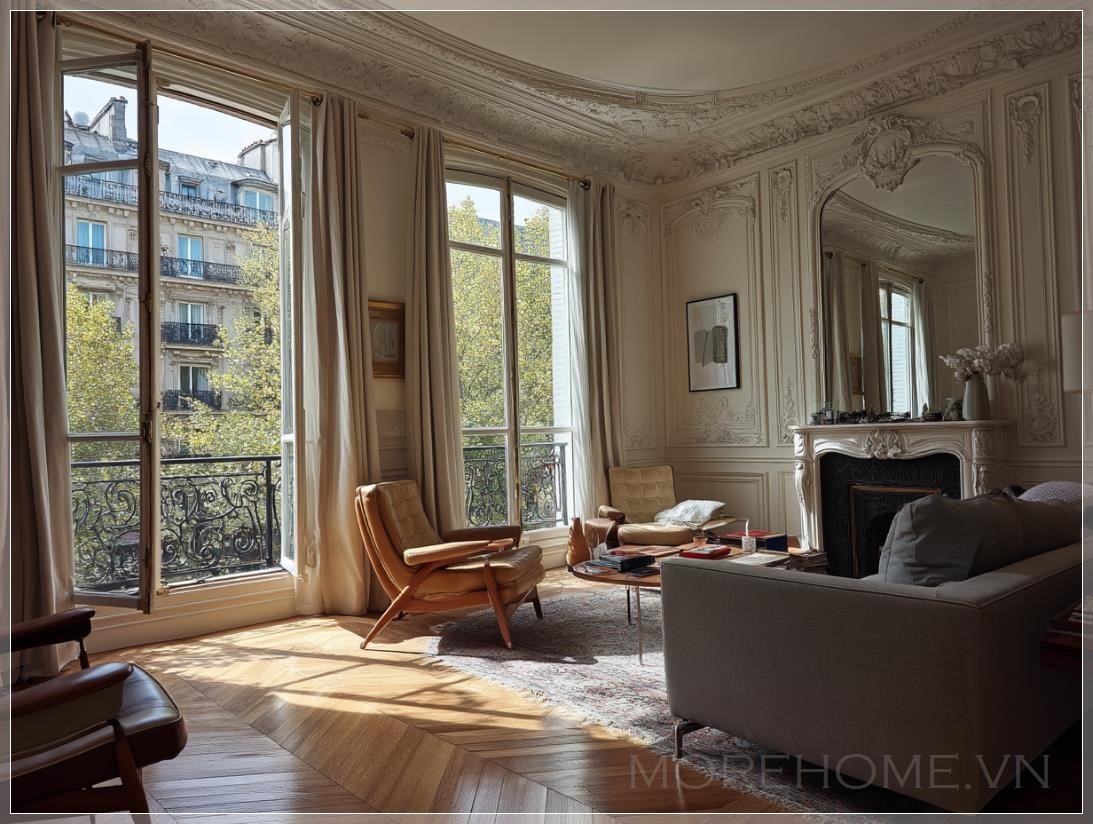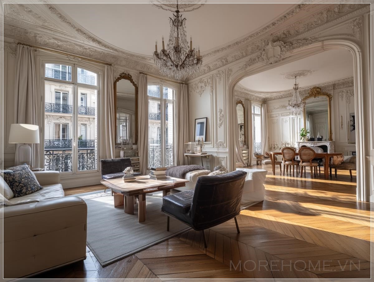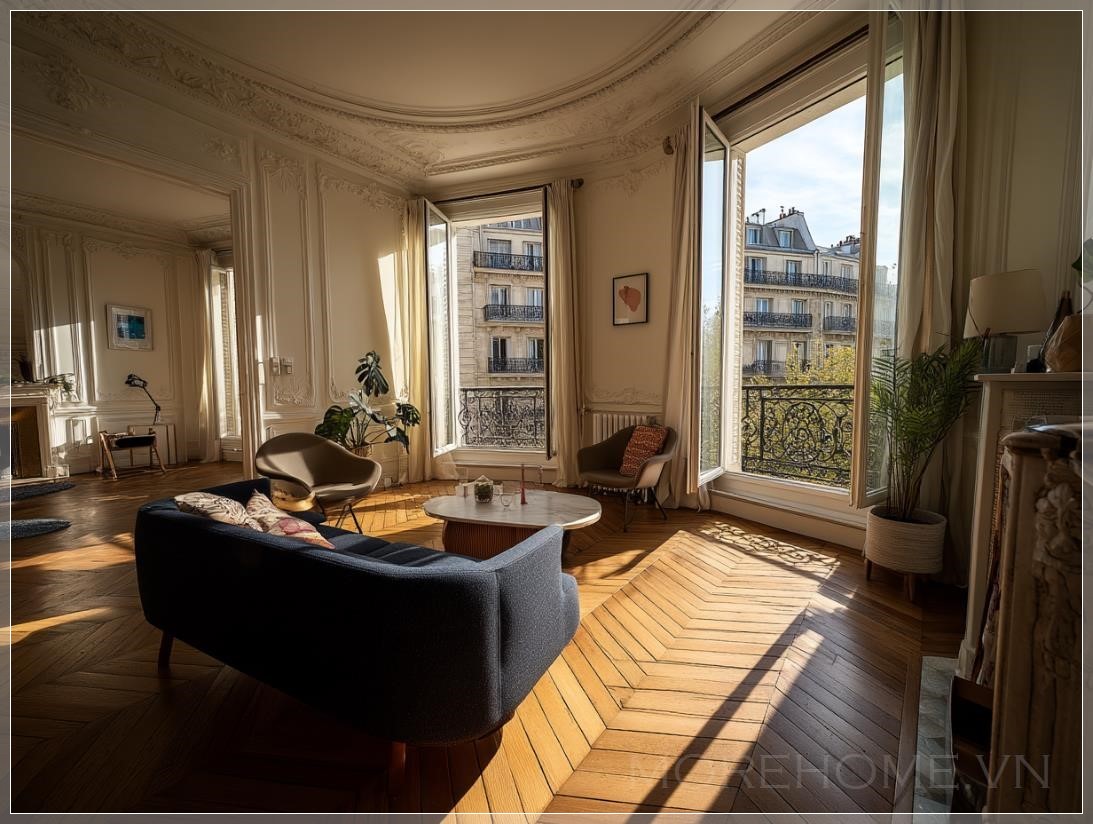 Cảnh chụp của một căn hộ Haussmannian sang trọng ở Paris, được chụp bằng máy Sony A1 với ống kính góc rộng. Cảnh vật là một shot dài vào một ngày nắng, ánh sáng tự nhiên chiếu rọi qua các cửa sổ lớn, làm nổi bật không gian nội thất tinh tế và cổ điển. Các chi tiết như tường với các hoa văn tinh xảo, sàn gỗ bóng loáng và đồ nội thất đẳng cấp mang lại vẻ đẹp sang trọng, lịch lãm. Cảm giác thoáng đãng, rộng rãi và đầy sự tinh tế từ phong cách thiết kế đặc trưng của Paris.