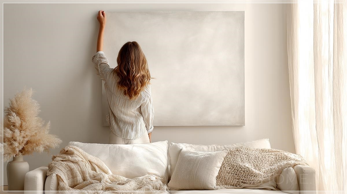 Nội thất trong căn phòng được lựa chọn cẩn thận – một chiếc sofa màu kem nhạt với đường nét mềm mại, một chiếc bàn cà phê thấp bằng gỗ sáng màu, và một tấm thảm màu be tinh tế trải trên sàn gỗ óng ánh. Tất cả đều hòa quyện trong một bản hòa tấu của những gam màu trung tính, tạo nên nền tảng hoàn hảo cho bức tranh canvas trắng trở thành điểm nhấn.