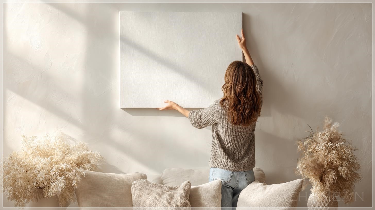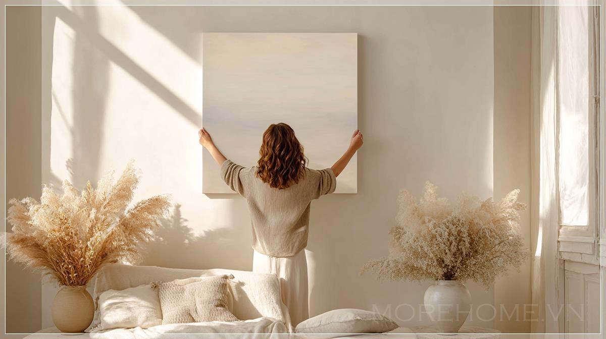 Trong tiết trời êm dịu của buổi sáng, ánh nắng tràn vào phòng khách qua những ô cửa sổ rộng không bị che chắn. Đó là khoảnh khắc mà Minh Tâm quyết định treo tấm canvas trắng tinh khôi lên bức tường sáng màu. Một hành động đơn giản nhưng lại mang đến sự biến đổi tinh tế cho toàn bộ không gian.