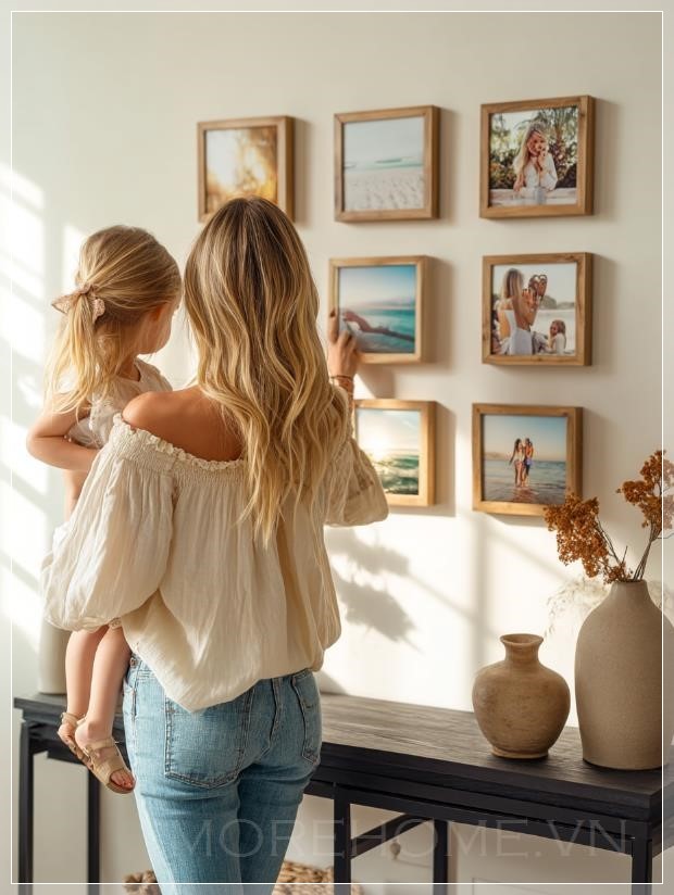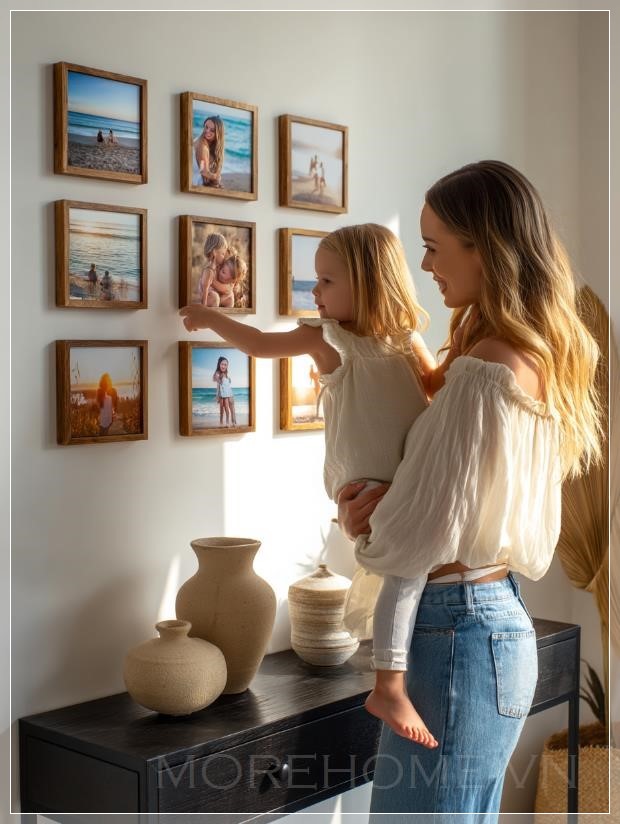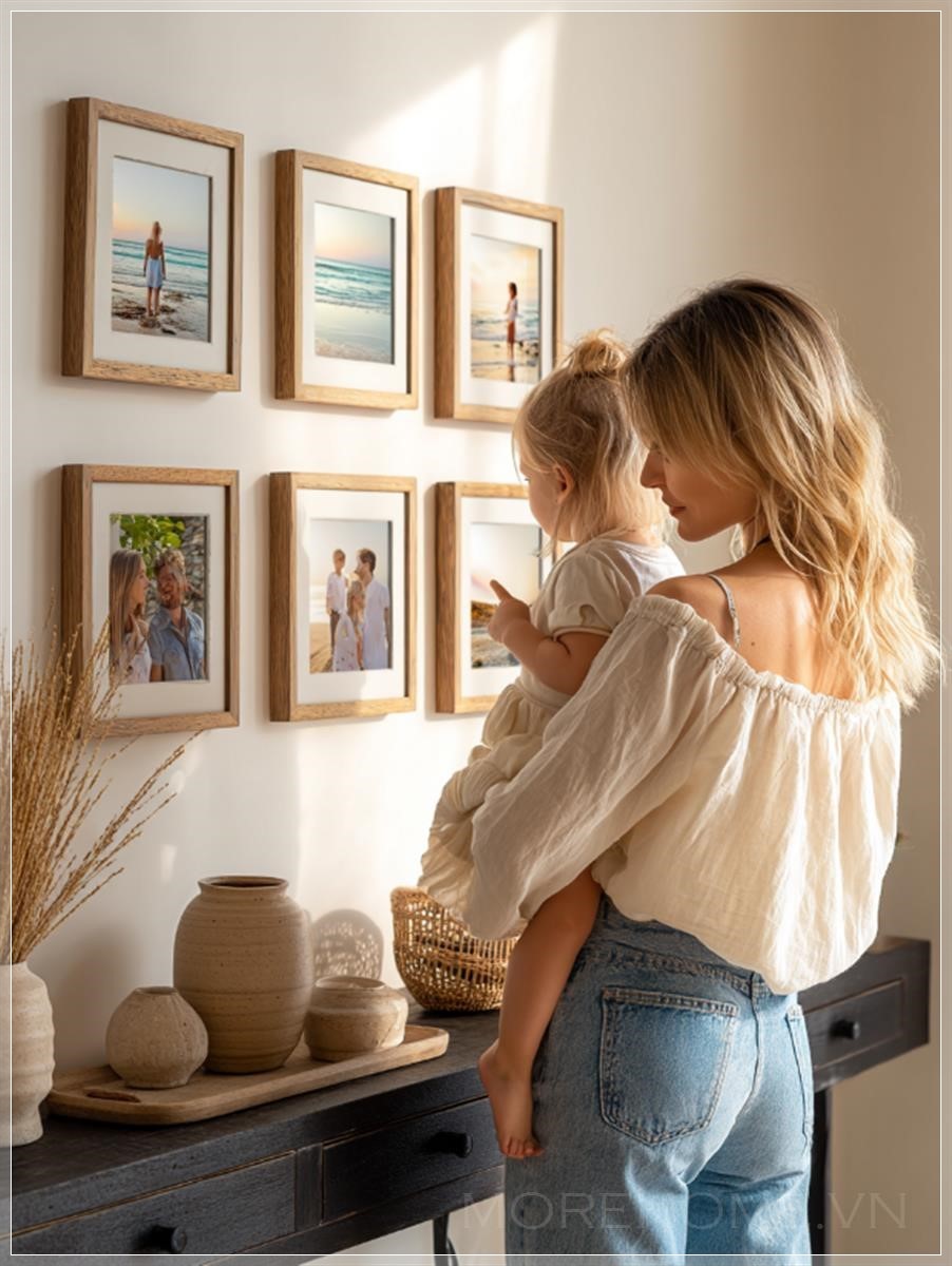 Ánh nắng chiều dịu nhẹ len lỏi qua khung cửa sổ, tạo nên những vệt sáng ấm áp trên bức tường phòng khách. Một người mẹ trong chiếc áo sơ mi màu kem và quần jeans xanh đang nâng cô con gái nhỏ tóc vàng lên cao, đôi mắt của cả hai cùng hướng về bức tường trước mặt - nơi đang trưng bày sáu khung ảnh vuông đẹp mắt được sắp xếp hoàn hảo thành một lưới ô vuông gọn gàng.