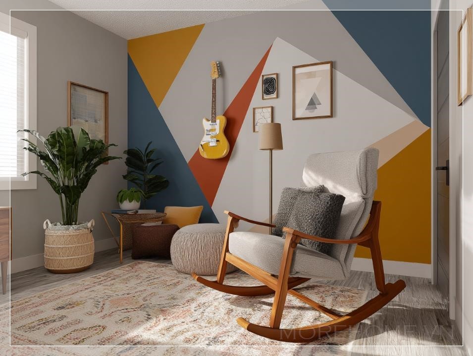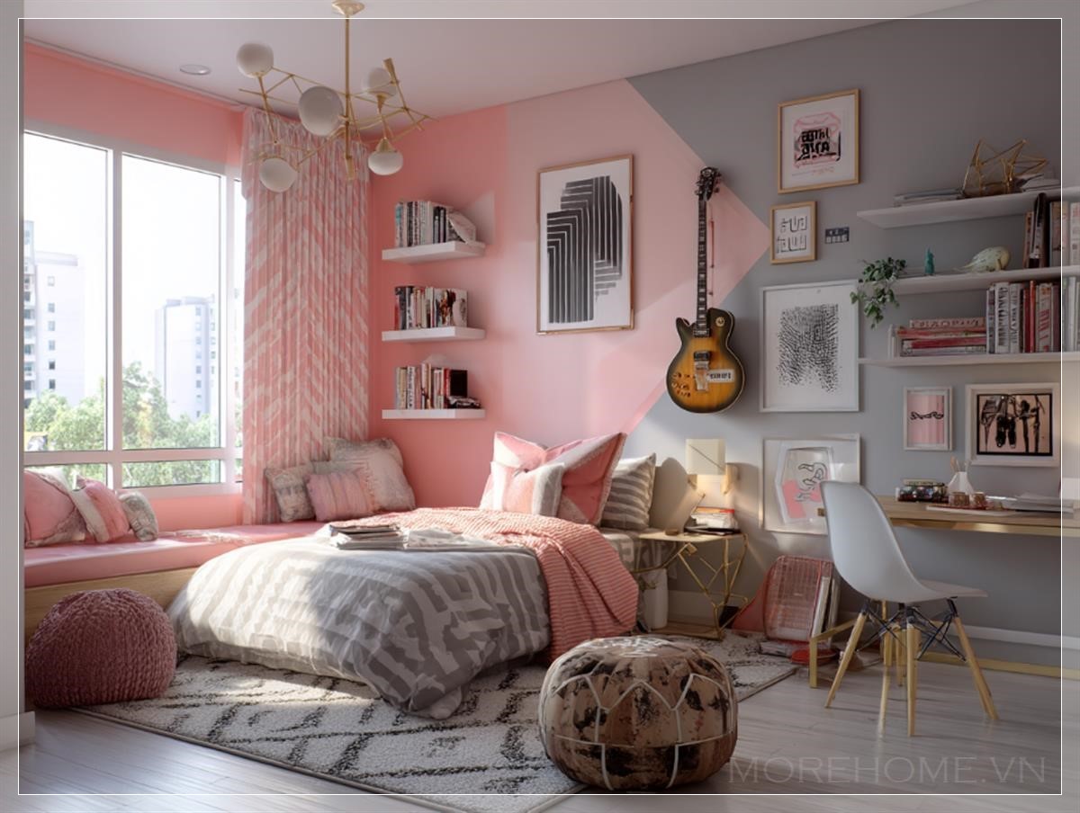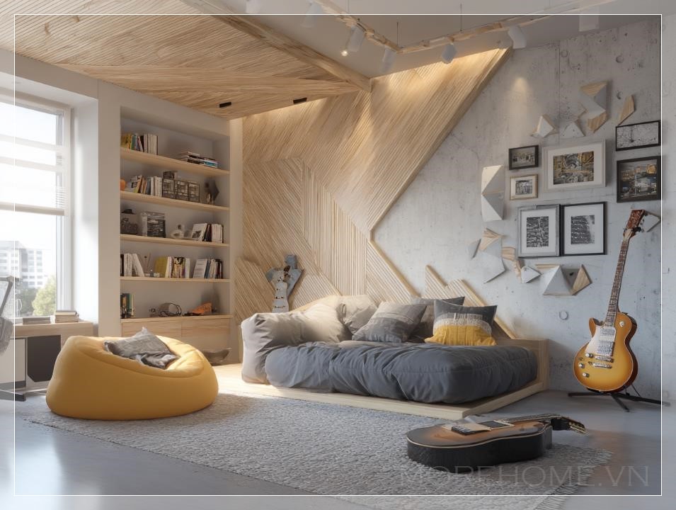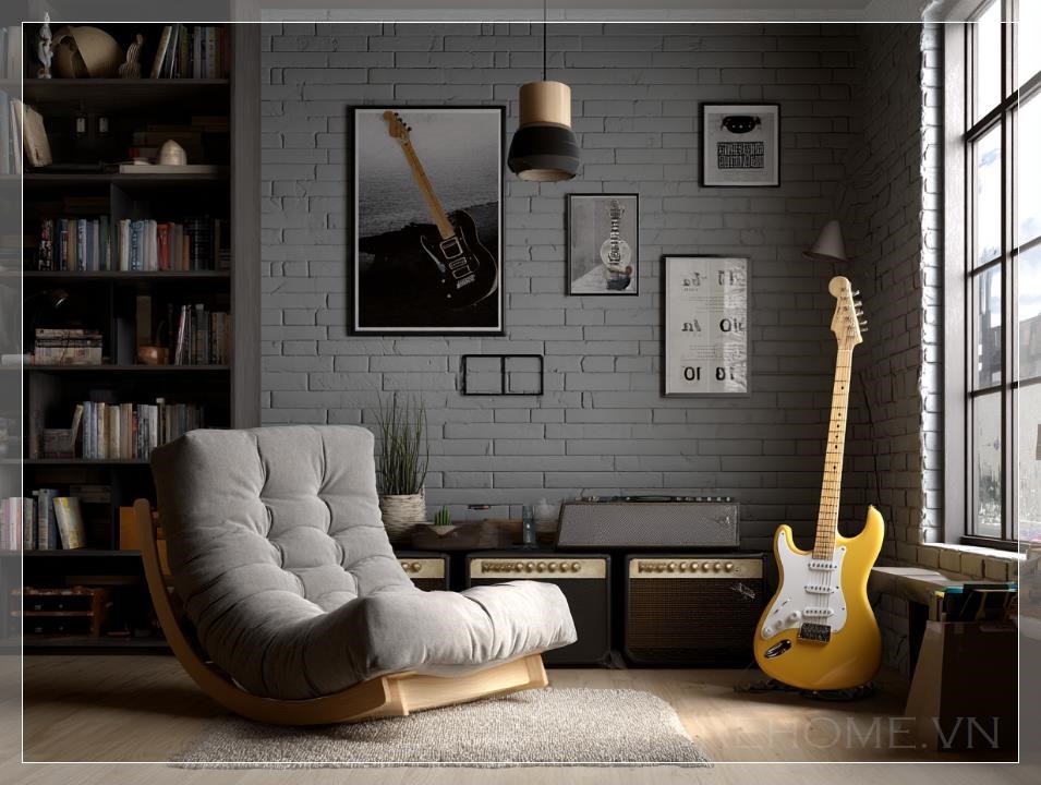 Ngay giữa bức tường, một chiếc guitar điện màu đỏ đậm được treo, nó không chỉ là một món đồ trang trí mà là trung tâm của phòng, gợi nhắc về niềm đam mê và sự sáng tạo không ngừng. Những chiếc đèn neon sắc màu, phủ một lớp ánh sáng mềm mại, tạo ra không gian ấm áp nhưng đầy mạnh mẽ. Bên cạnh đó, một số chiếc poster của những ban nhạc rock nổi tiếng cũng được xếp đặt ngẫu nhiên nhưng đầy hài hòa, tạo ra một góc nhìn mạnh mẽ, đầy cá tính, vừa hoài cổ lại vừa hiện đại.