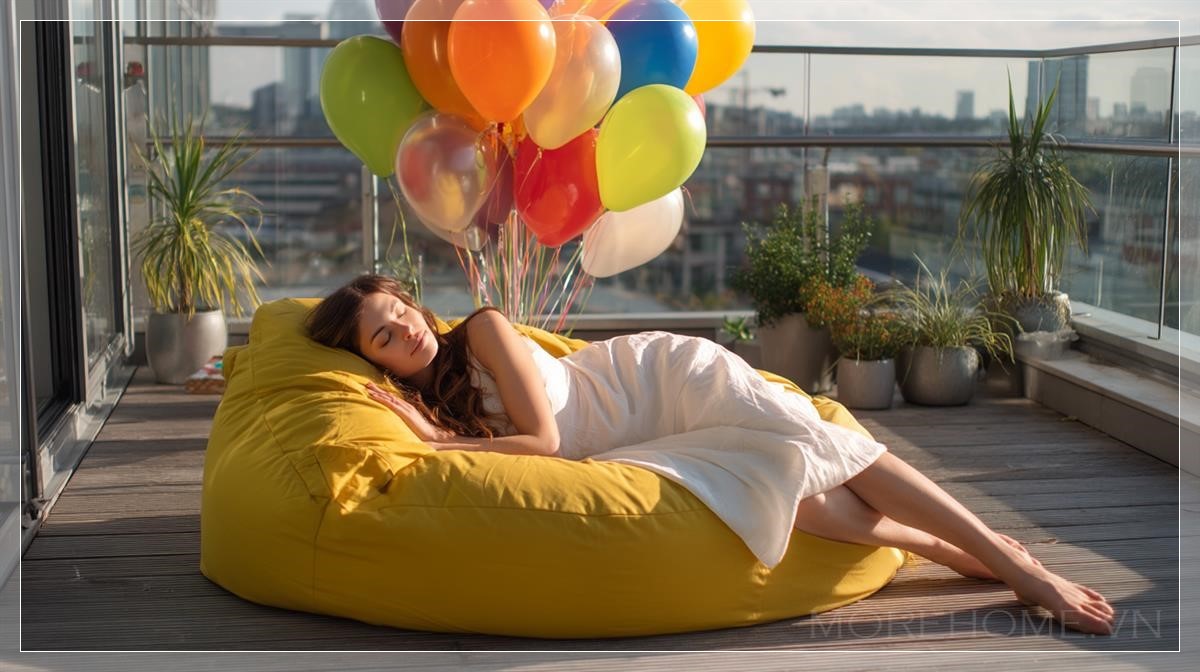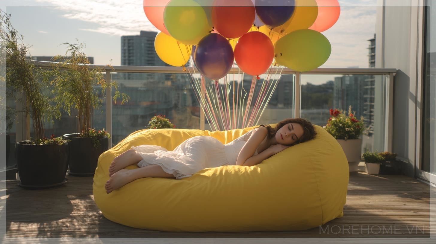 Chiếc ghế lười mềm mại, với chất liệu vải mờ nhẹ nhàng, được buộc vào 25 quả bóng bay đầy màu sắc. Những sợi dây mảnh nhẹ nhàng bay theo gió, tạo nên một cảnh tượng như từ một giấc mơ. Ban công hiện đại với sàn gỗ sáng màu và lan can kính trong suốt mang đến cảm giác thư giãn, nhẹ nhàng. Những chậu cây xanh tươi được đặt xung quanh, như góp phần làm dịu mát không gian và làm tôn lên vẻ đẹp giản dị của cô gái.