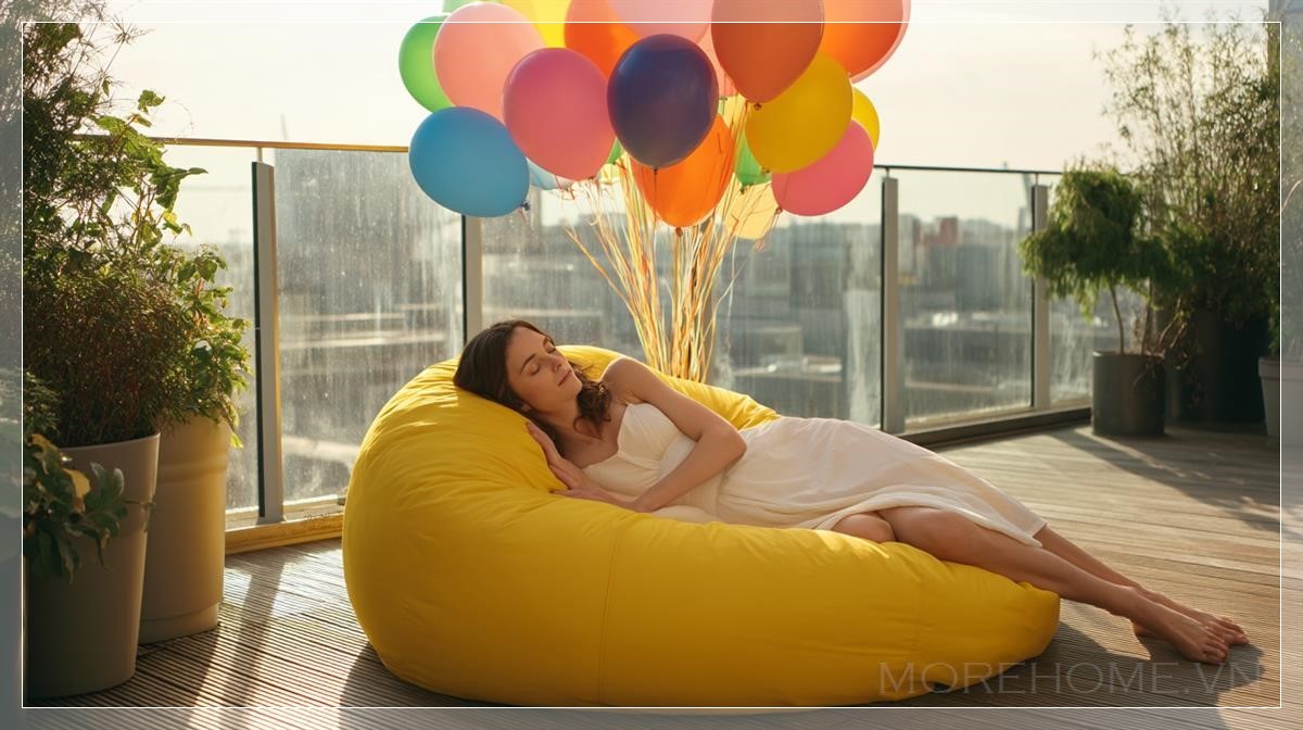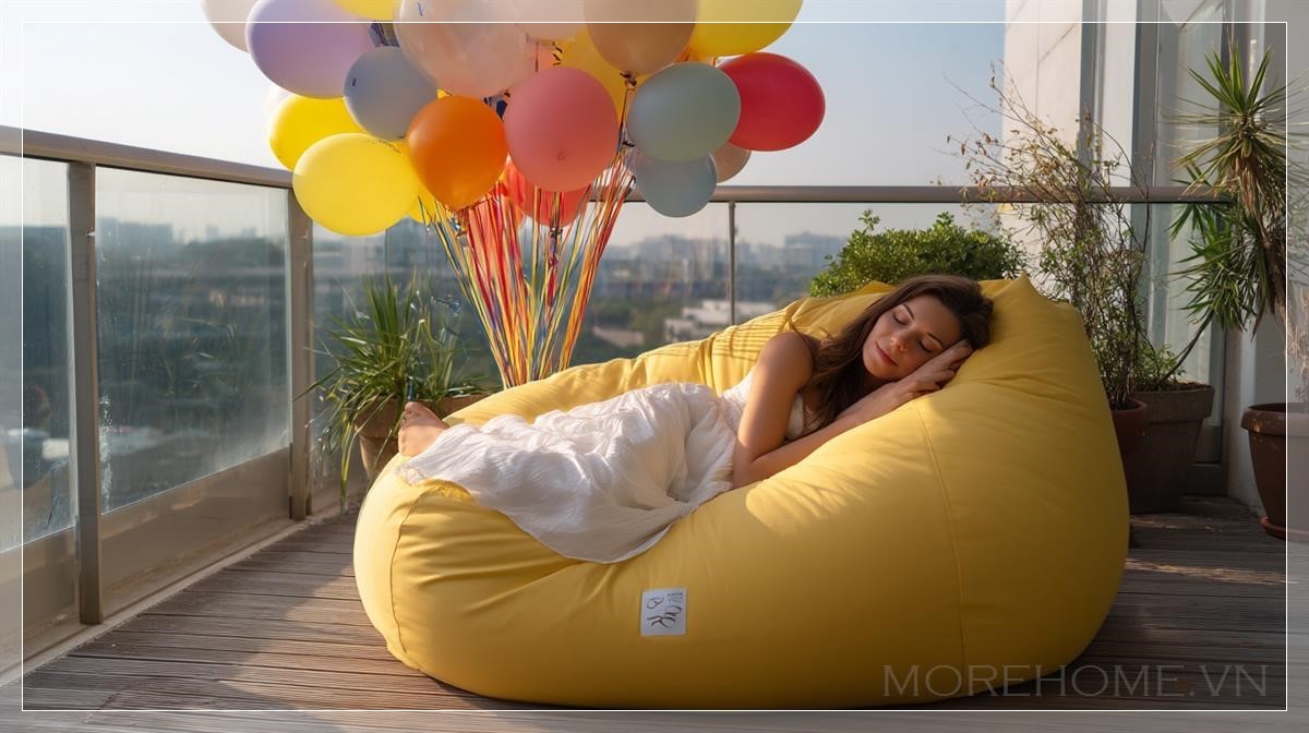 Ánh sáng nhẹ nhàng của buổi sáng chiếu sáng lên khuôn mặt thanh tú của người phụ nữ trong bộ váy trắng đơn giản, khi cô đang yên bình chìm vào giấc ngủ sâu trên chiếc ghế lười Yogibo Max màu vàng tươi. Mái tóc nâu dài của cô xõa mềm mại trên nền vải ghế mượt mà, cảm giác như đang tan chảy vào không gian tĩnh lặng của buổi sáng. Cô nằm nghiêng, đôi mắt khép lại, không gian xung quanh dường như ngừng chuyển động, chỉ còn lại cảm giác bình yên lan tỏa.
