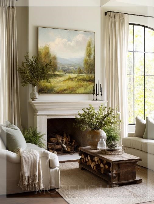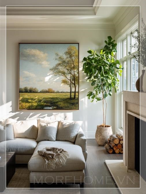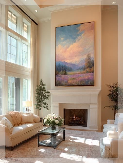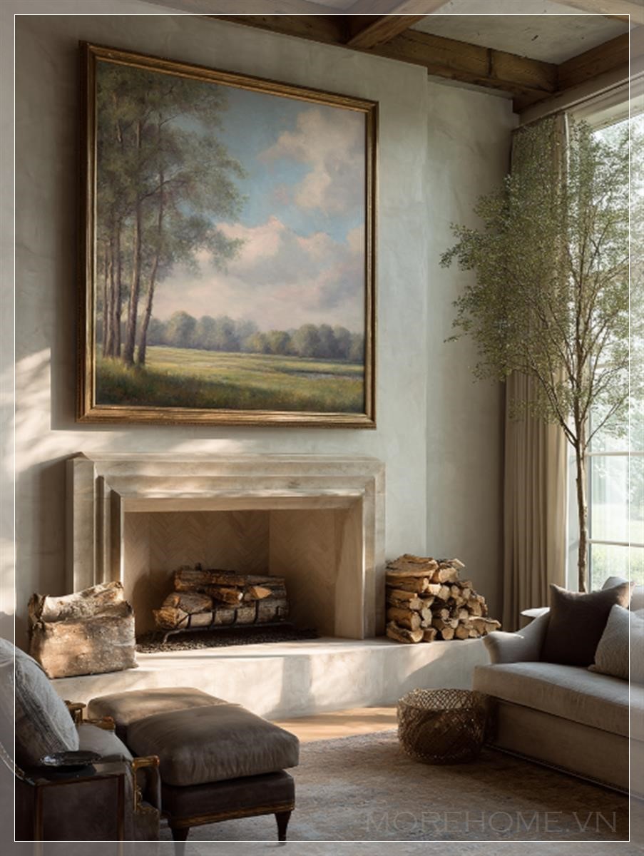 Trên bức tường phòng khách sang trọng, một bức tranh phong cảnh rộng lớn treo ngay trên lò sưởi, với những tông màu pastel nhẹ nhàng. Bức tranh như vẽ lên một khung cảnh tuyệt đẹp, nơi làn gió nhẹ nhàng thổi qua, mang đến cảm giác thư giãn và bình yên. Ánh sáng ấm áp từ những thanh củi cháy bập bùng, chiếu sáng từng góc nhỏ trong căn phòng, tạo nên không khí ấm cúng và thoải mái.