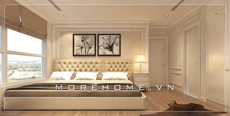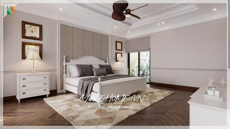 Thiết kế giường ngủ Master sang trọng, gam màu trắng chủ đạo kết hợp nỉ đầu giường tinh tế, đúng với gu thẩm mỹ của gia chủ