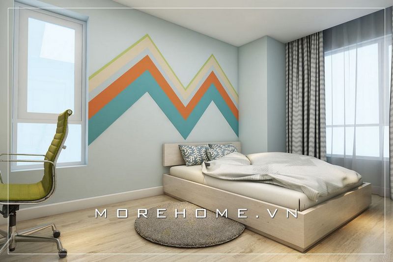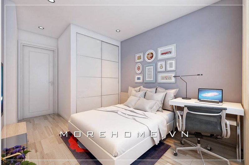 Thiết kế giường ngủ con trai phong cách hiện đại, trẻ trung, ở không gian này, KTS cũng lựa chọn tone màu trắng chủ đạo mang lại cho khu vực phòng ngủ thêm cơi nới, rộng rãi hơn