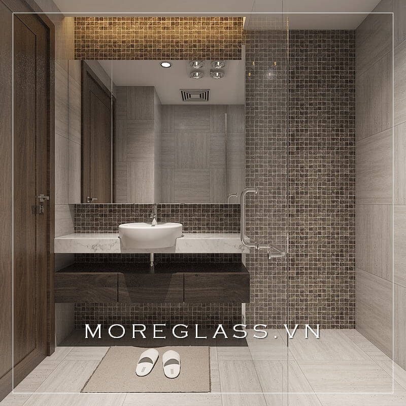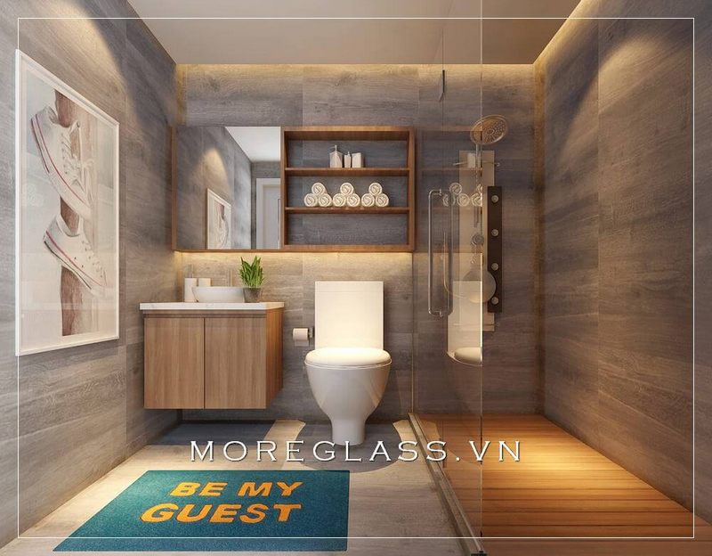 Mẫu thiết kế nhà vệ sinh hiện đại sử dụng vách kính đứng để tách biệt hai khu vực tắm và vệ sinh, giúp tạo ra cảm giác rộng rãi trong phòng.