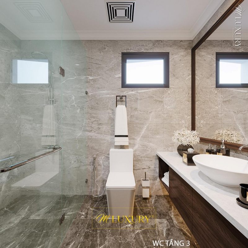 Màu sắc độc đáo của đá ốp tường làm cho không gian phòng tắm trở nên đặc biệt.